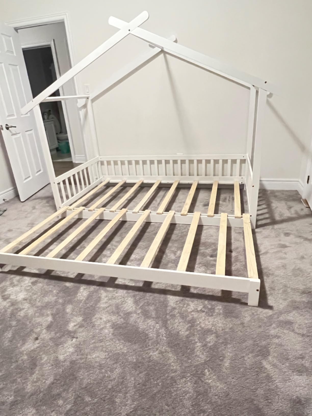 This twin to king house bed marries creativity with flexibility. Designed to grow with your family, this bed easily expands from a twin-size to a king-size, catering to your child’s needs from tot to teen. The imaginative bed features a playful roof that stimulates your kid’s imagination. Besides, crafted with sturdy plywood slats, the house bed presents excellent stability and durability. The safety features, such as the fence rails, offer peace of mind by helping prevent falls. The low-to-the-floor design promotes independence, making it easier for kids to climb in and out. Suitable for both boys and girls, the extendable house bed integrates seamlessly into any room decoration.