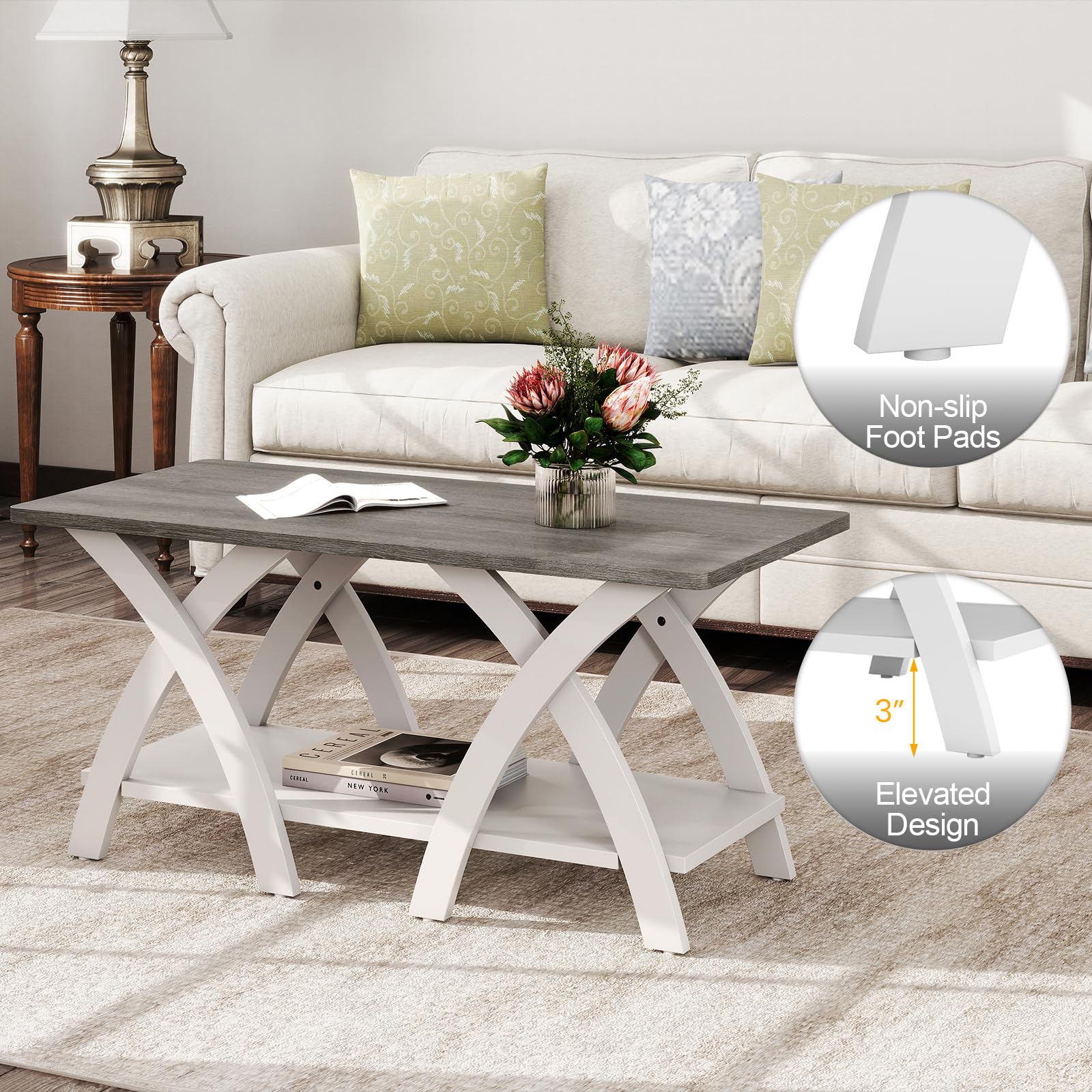 Crafted from solid rubber wood for durability, this table features a spacious tabletop and an additional shelf below, offering ample storage for all your essentials, from books to laptops. The wood grain finish and X-shaped support legs not only provide stability but also enhance the aesthetic, seamlessly incorporating a touch of elegance into your space. With thoughtful details such as elevated design, non-slip foot pads, and rounded corners, this versatile coffee table is ideal for dining, working, or socializing, making it a must-have in any modern living area.