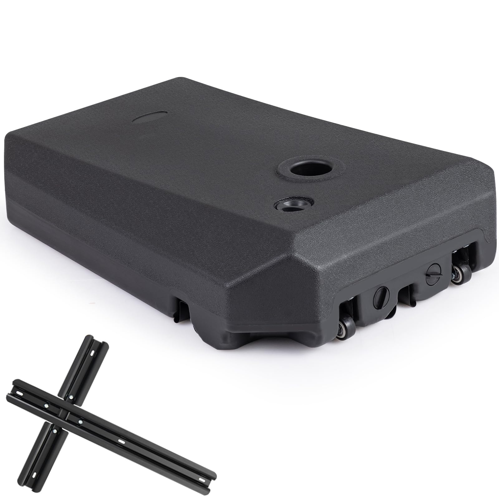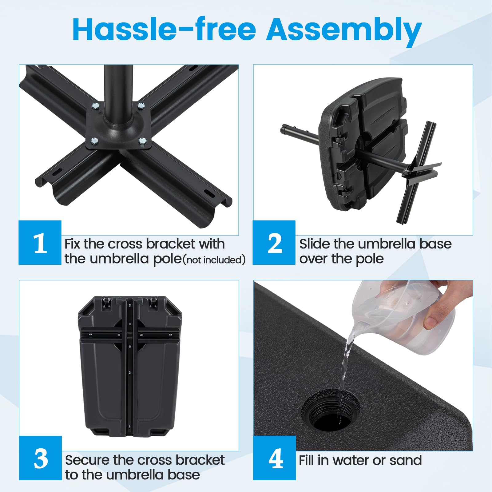 Keep your cantilever umbrella stable and secure with this refillable patio umbrella base. Fill with water, sand, or a mix for reliable weight. Made from premium HDPE, it is waterproof, fade-resistant, and built to last. Move your umbrella effortlessly with smooth-rolling wheels and convenient handles. The universal cross bracket fits poles up to 2.6" in diameter. Quick-fill inlet and dual drainage holes make setup and storage easy, while tool-free assembly gets you ready in minutes.