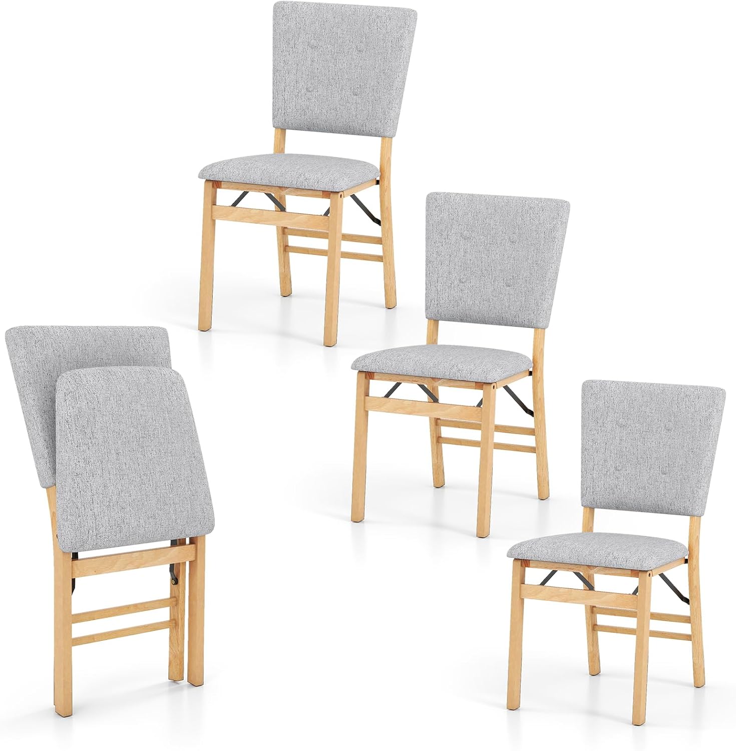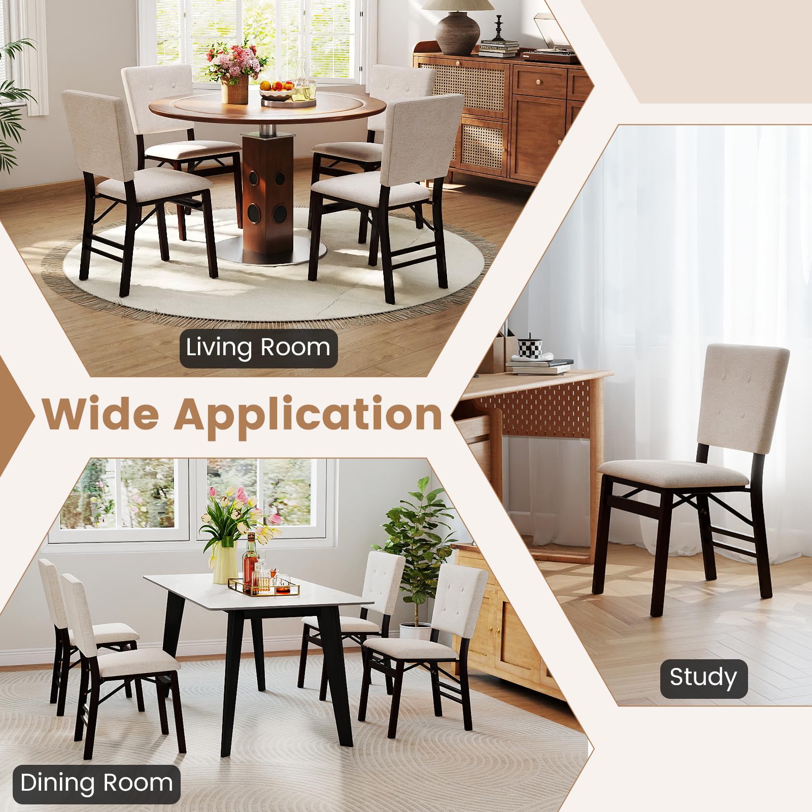 These upholstered dinette chairs combine both comfort and practicality. Crafted with a natural rubber wood frame, they offer sturdy support for up to 353 lbs, enhanced by non-slip foot pads and a reinforced crossbar. The seats and backrests are wrapped in soft sponge cushions covered with wear-resistant, skin-friendly linen fabric for a gentle, comfortable touch during long meals. When not in use, the chairs fold compactly for easy storage in tight spaces and their lightweight design makes them simple to move. These chairs are suitable for various settings like living rooms, kitchens, or restaurants, seamlessly blending into any interior.