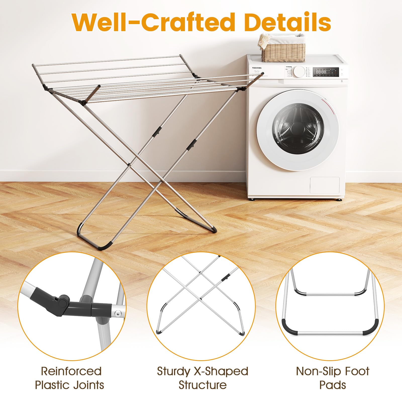 This portable laundry rack features a lightweight and rustproof aluminum frame that offers exceptional strength, ensuring long-lasting use. It provides an impressive 60 ft/18 m drying space with 14 rods, perfect for towels, dresses, shirts, socks, pants, pillows and more. The drying rack folds flat in seconds, weighing only 3.7 lbs/1.7 kg, making storage and transport incredibly easy. The wide rod spacing helps dry clothes faster with optimal ventilation and minimizes fabric contact to reduce the wrinkles. The clothes drying rack with well-crafted details stands freely without assembly, ideal for both indoor and outdoor use.