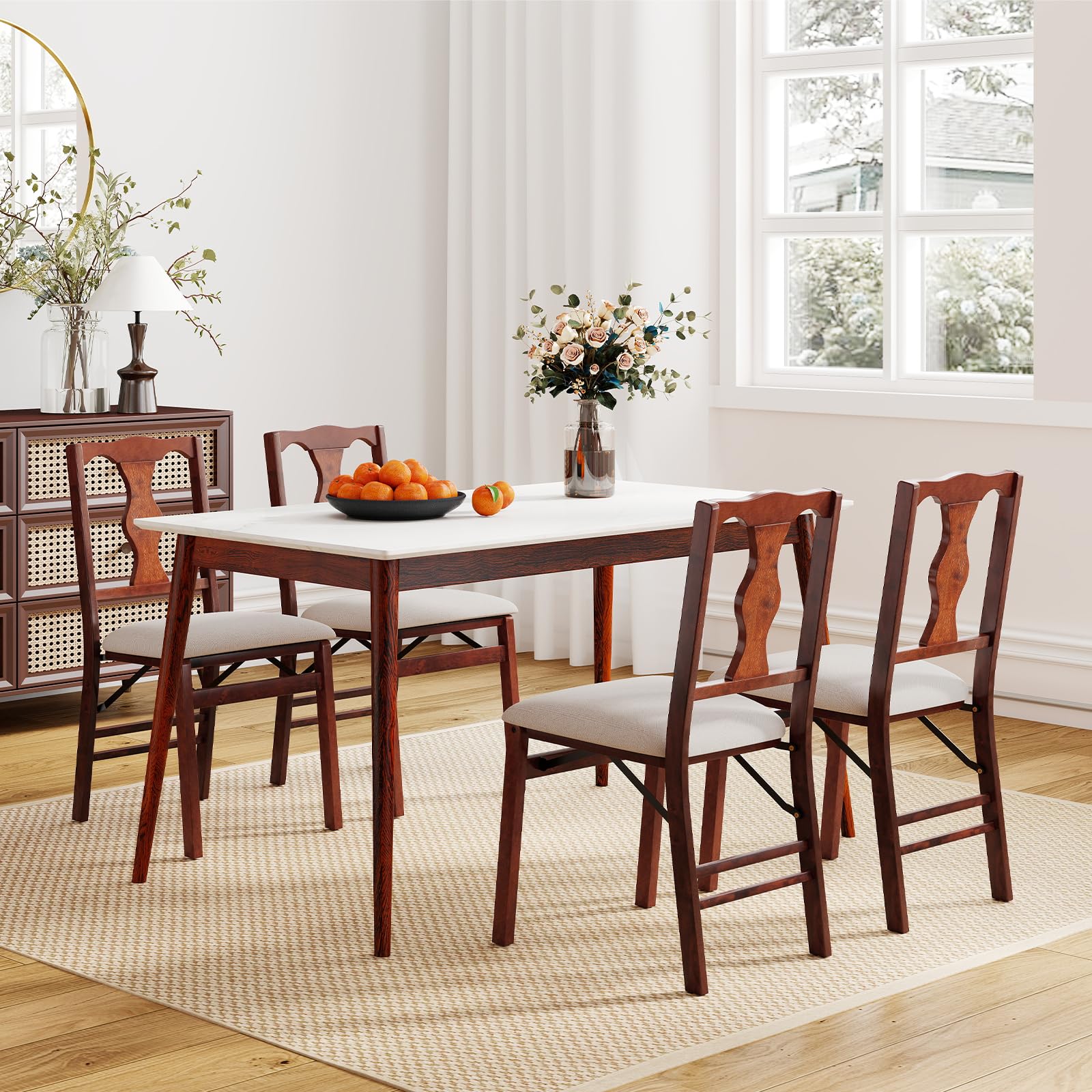 The wooden dining chairs cradle your back with an ergonomic curve, letting conversations linger long after dessert. The skin-friendly linen fabric cover and soft sponge filling ensure a comfortable sitting experience. Additionally, the solid rubber wood frame and anti-slip foot pads keep the chairs steady and stable. The high-quality rubber wood frame is also supportive and built-to-last. When the evening ends, the foldable chairs can be easily folded down through the folding devices and stored beneath the bed or behind the door.
