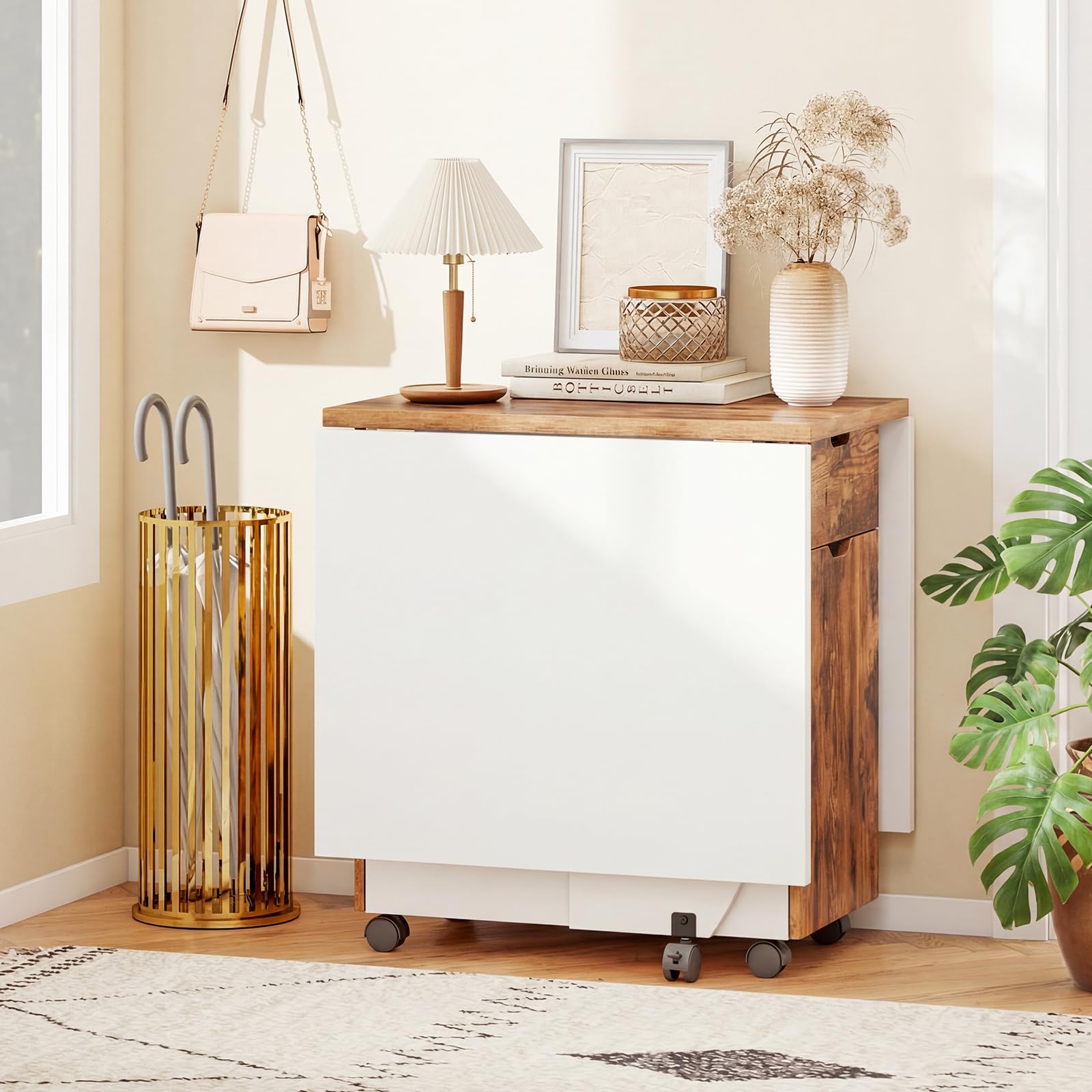 Crafted from sturdy wooden boards, the kitchen table supports up to 133 lbs, ensuring durability and stability. Plus, this versatile 3-in-1 folding table seamlessly combines dining, working and storage needs with the collapsible design, easily switching between fully expanded, half-expanded and folded states. The spacious tabletop, complemented by 2 large drawers and 2 cabinets, provides ample organized storage for kitchen supplies or work essentials. Moreover, equipped with 6 universal casters (2 lockable), this drop leaf extension table offers convenience and flexibility, fitting perfectly into various home settings such as dining rooms, craft studios or home offices.