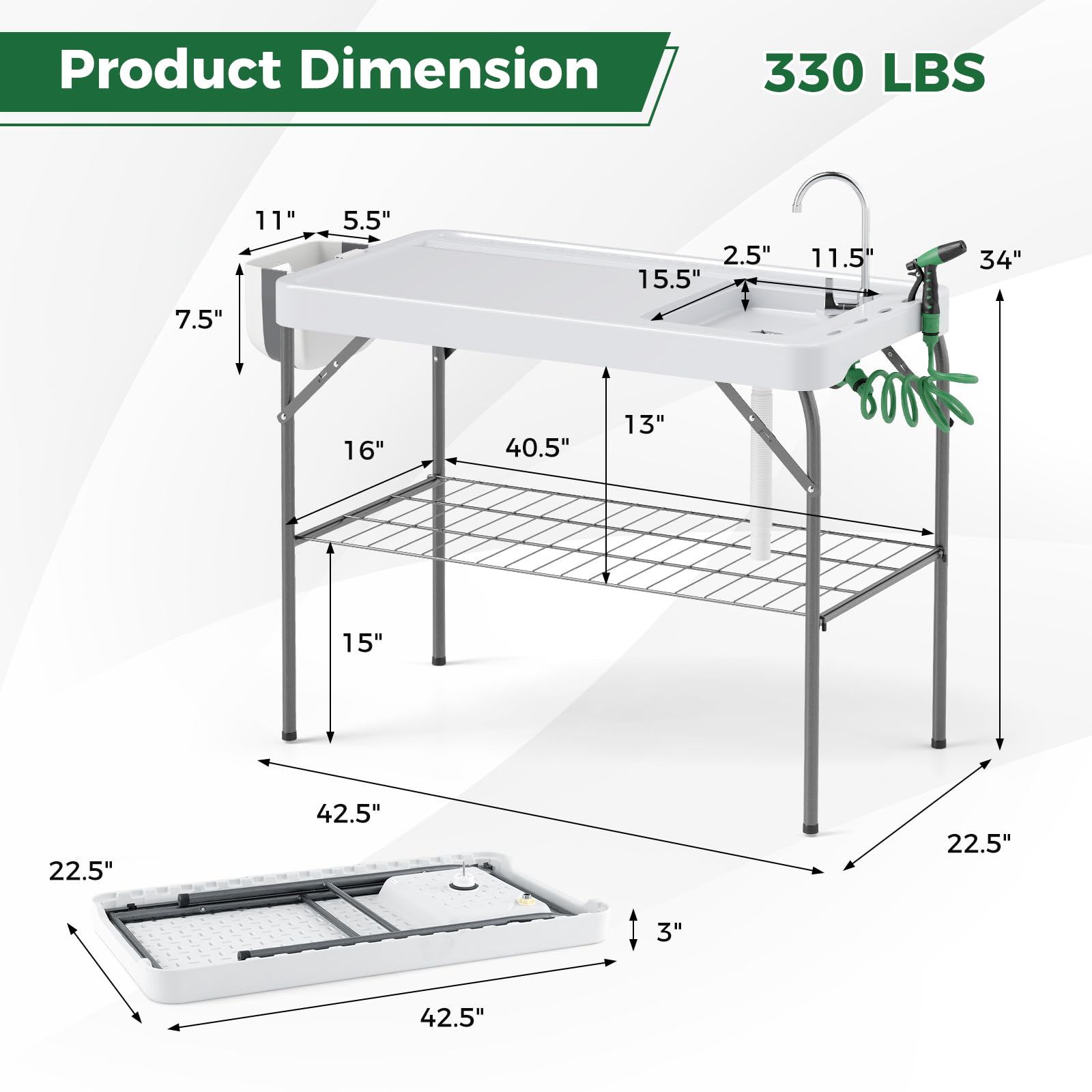 - [Functional Cleaning Workstation]: The fish cleaning table is equipped with a sink that allows you to clean fish and vegetables with ease. The 360° rotatable faucet and spray nozzle make the cleaning process a breeze. Additionally, a 3-way connector enables you to connect a standard garden hose (not included).