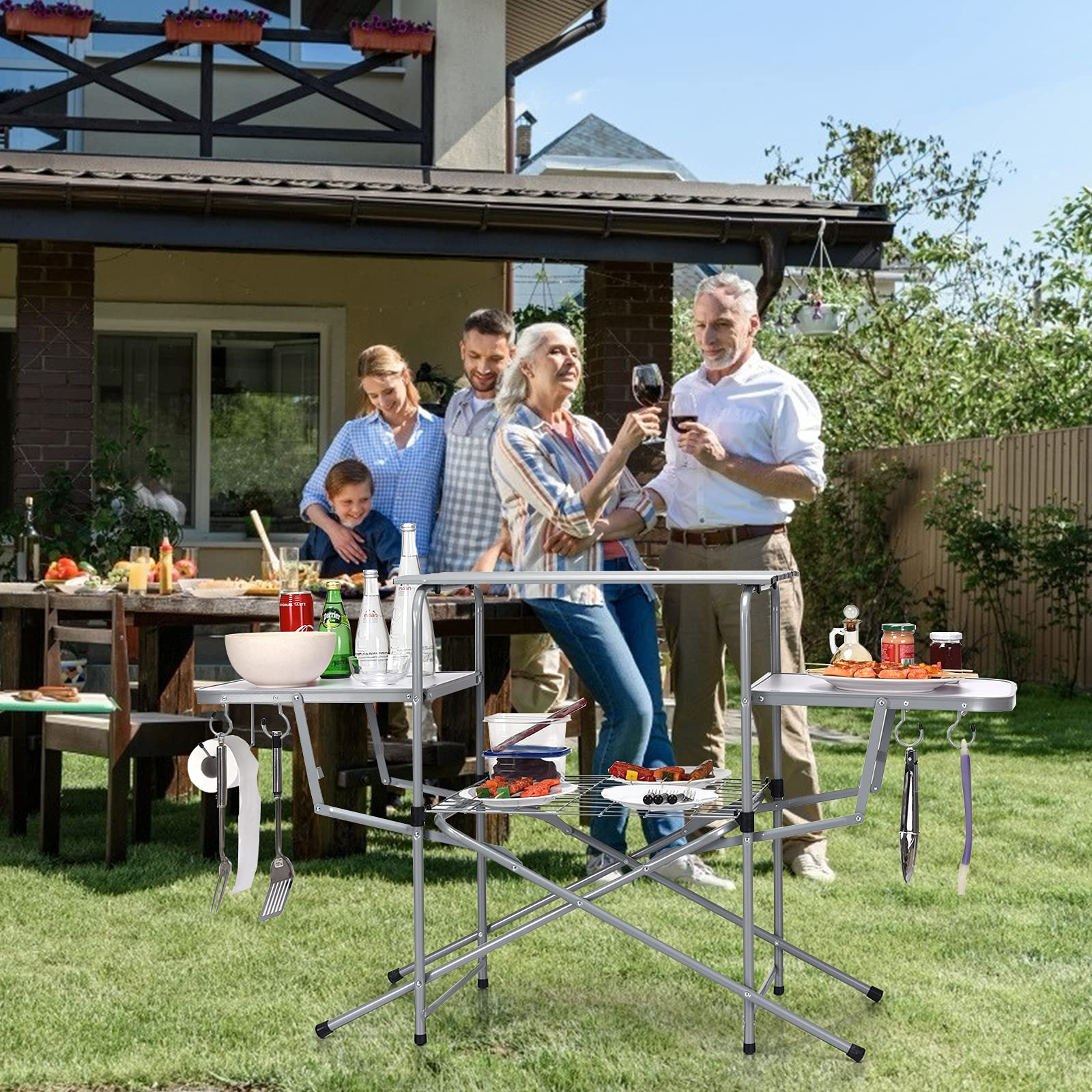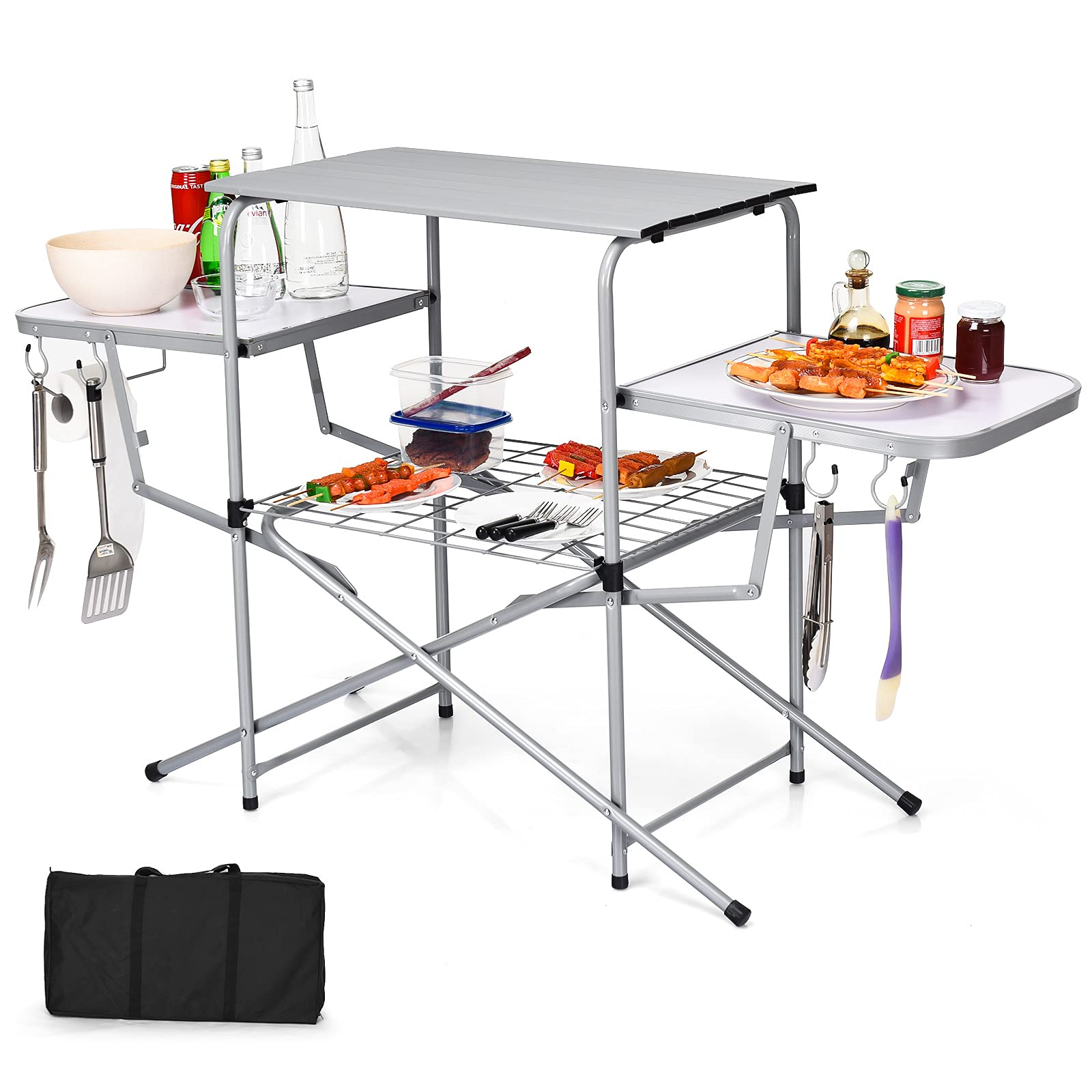 Experience all the comforts of home on your next outdoor adventure with this foldable camping grilling table. Equipped with sturdy steel,heat-resistant aluminum and moisture-resistant MDF, it features heavy-duty,durability, stability so that can service you for long time. This outdoor kitchen stand also features a large top surface area, two side tables and a lower shelf ideal for storing supplies and condiments. It includes attached hooks for hanging grilling tools and a paper towel rack. The lightweight and one-piece design make you hold easily and provide you a lot storage room. Easy set-up and folding down less than a minute allow you enjoy the camping trip as soon as possible.