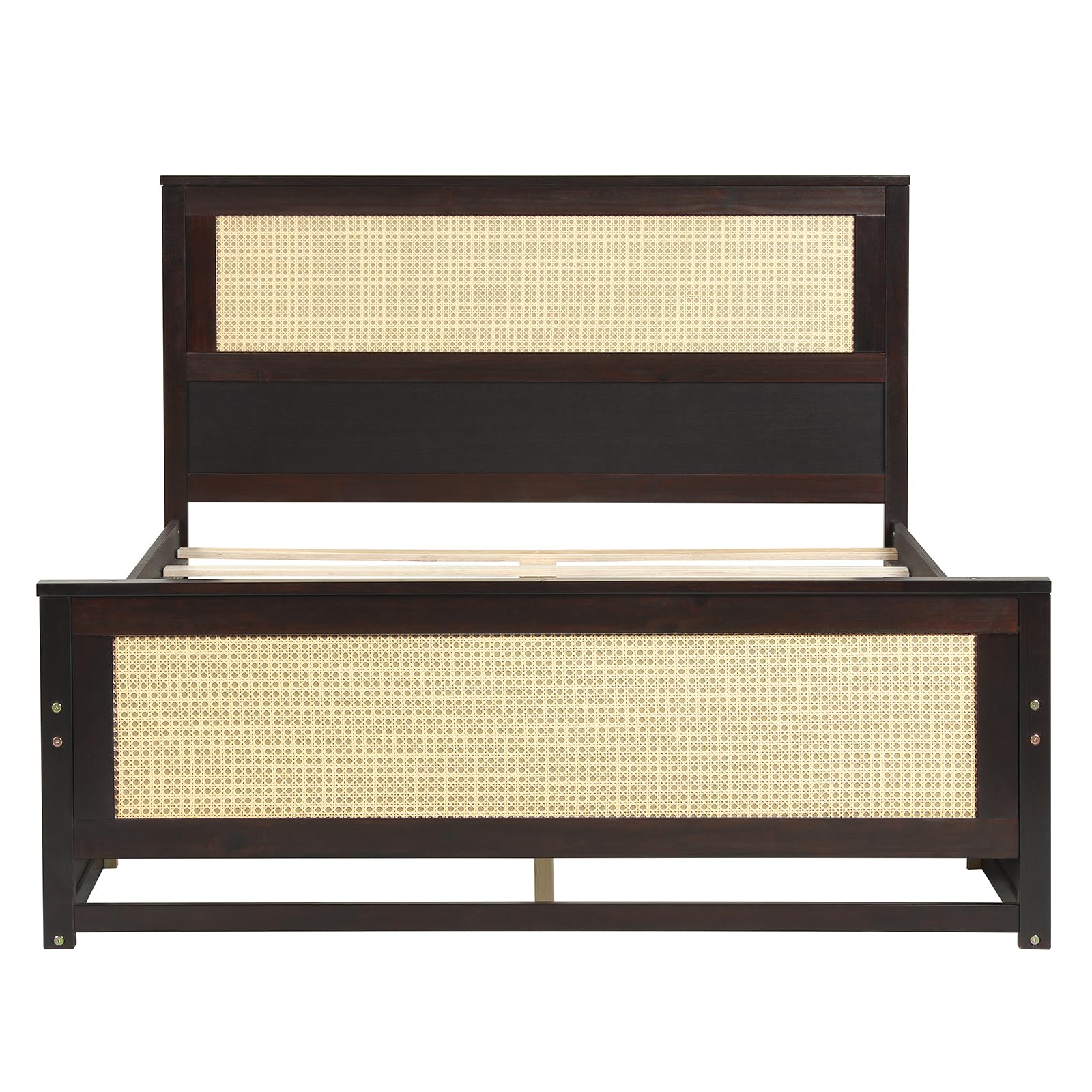 Upgrade your bedroom with this stylish rattan platform bed, designed to blend beauty and practicality! The 2 smooth-gliding drawers provide effortless storage for your clothes and essentials, while the clever nightstand clearance ensures easy access at any time. Crafted from high-quality wood and sturdy plywood slats, it offers excellent support for a quiet, stable, and restful night’s sleep. No more annoying creaks! The elegant full-panel base keeps your space looking neat by concealing under-bed clutter, and the distinctive rattan headboard brings a breezy, natural charm to your space. Forget the box spring. This bed’s recessed platform keeps your mattress firmly in place, not easy to slide. Transform your bedroom into a serene retreat now!
