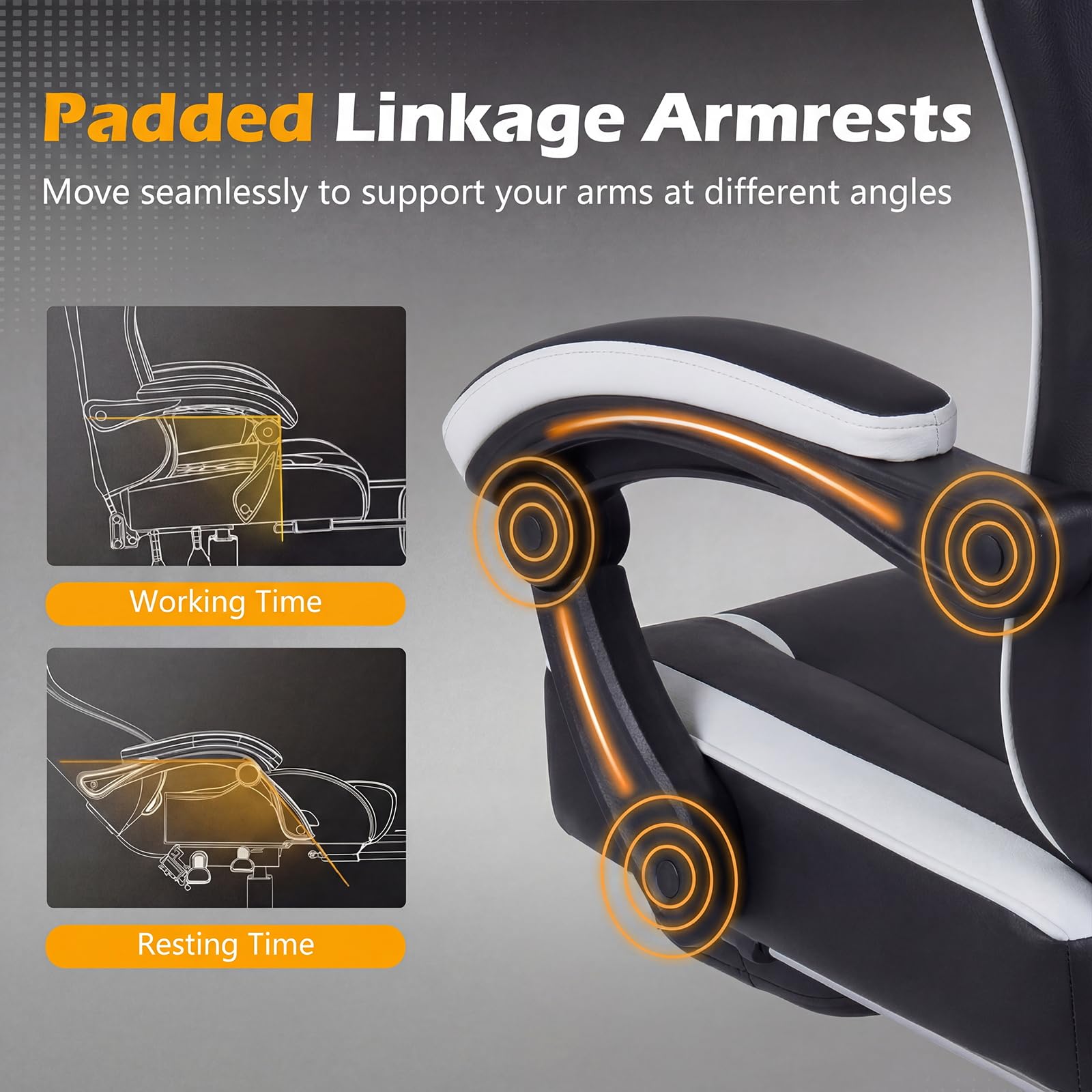 Padded linkage armrests move seamlessly to support your arms at different angles