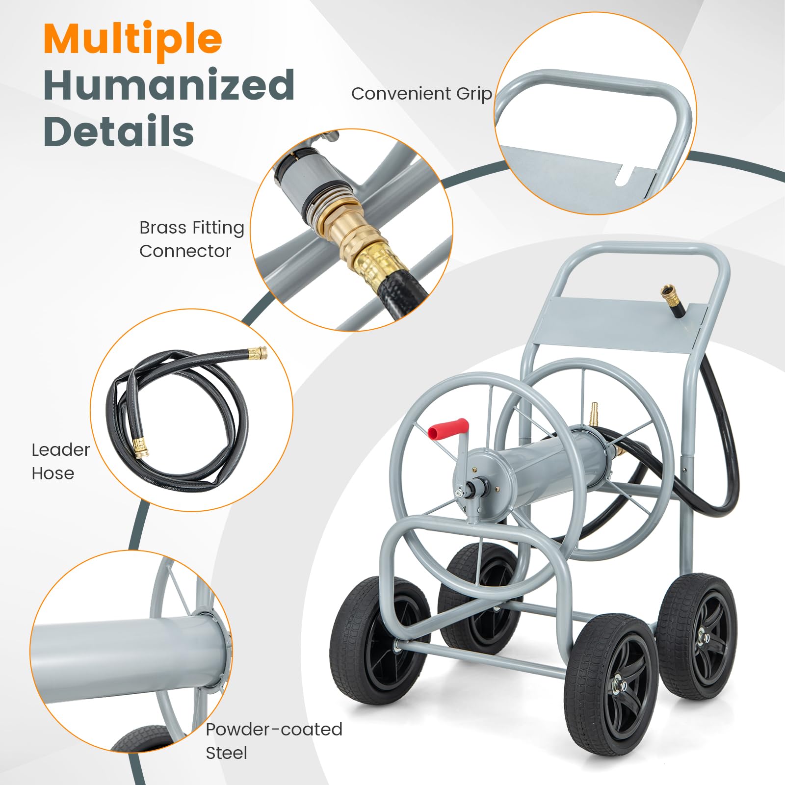 Are you still struggling with a large watering area? Our garden hose reel cart can holds up to 330ft of 5/8", 330ft of 3/4" or 400ft of 1/2’’ hose (not included), whose capacity is larger than others. And a 7ft leader hose is long enough to connect the water system. Hence, you can easily water any corner in your garden or farm. Besides, a non-slip handle will help you easily wrap the hose around the hose reel. With a strong powder-coated metal frame, the hose cart has superior durability and weather resistance. At the same time, the brass fitting connector is also well processed to prevent water leakage. In addition, 4 rubber wheels and a handy grip make it easy for you to move the hose cart around the yard, farm or elsewhere. So whether it's watering the plants, washing the car or cleaning the yard, our 4-wheel hose truck is a great choice!