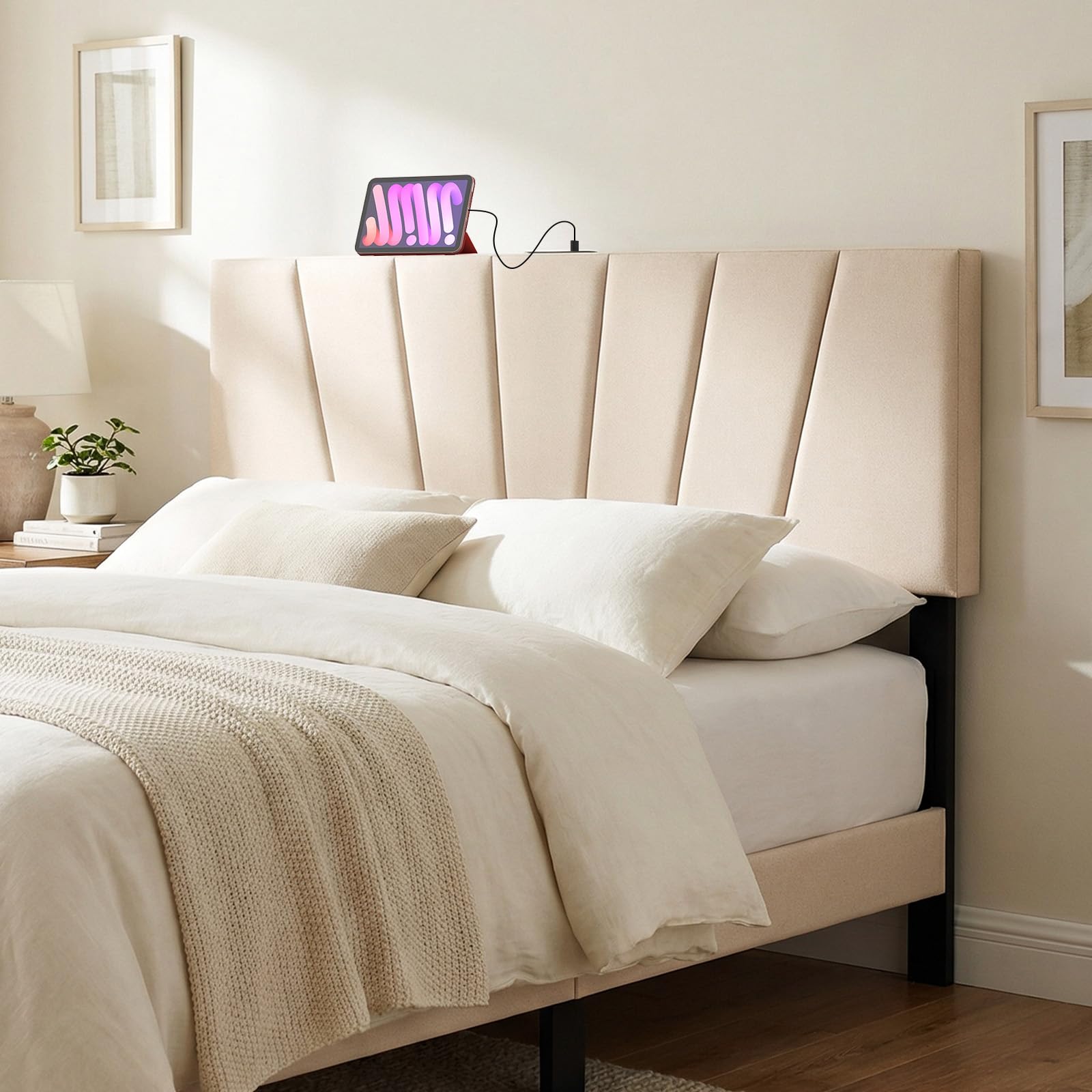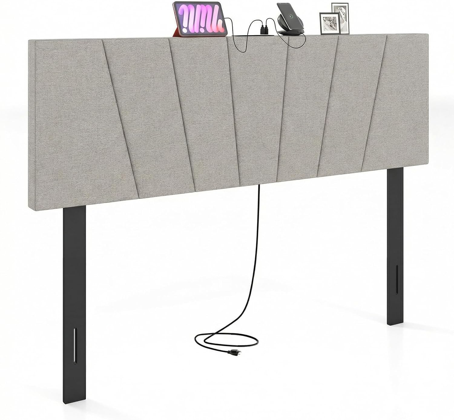 This modern upholstered headboard combines both style and functionality, featuring sturdy rubber wood legs known for their durability and crack resistance and a skin-friendly polyester fabric with elastic sponge filling for ultimate comfort while reading or lounging. Moreover, designed with geometric-shaped aesthetics, this bed head board enhances diverse contemporary or minimalist bedrooms with striking clean lines. Practicality meets convenience with built-in charging stations including 2 AC outlets, USB and Type-C ports, allowing you to power multiple devices at once. Additionally, its adjustable width fits the full and queen-sized bed seamlessly while the pre-drilled leg holes ensure an easy and hassle-free assembly.