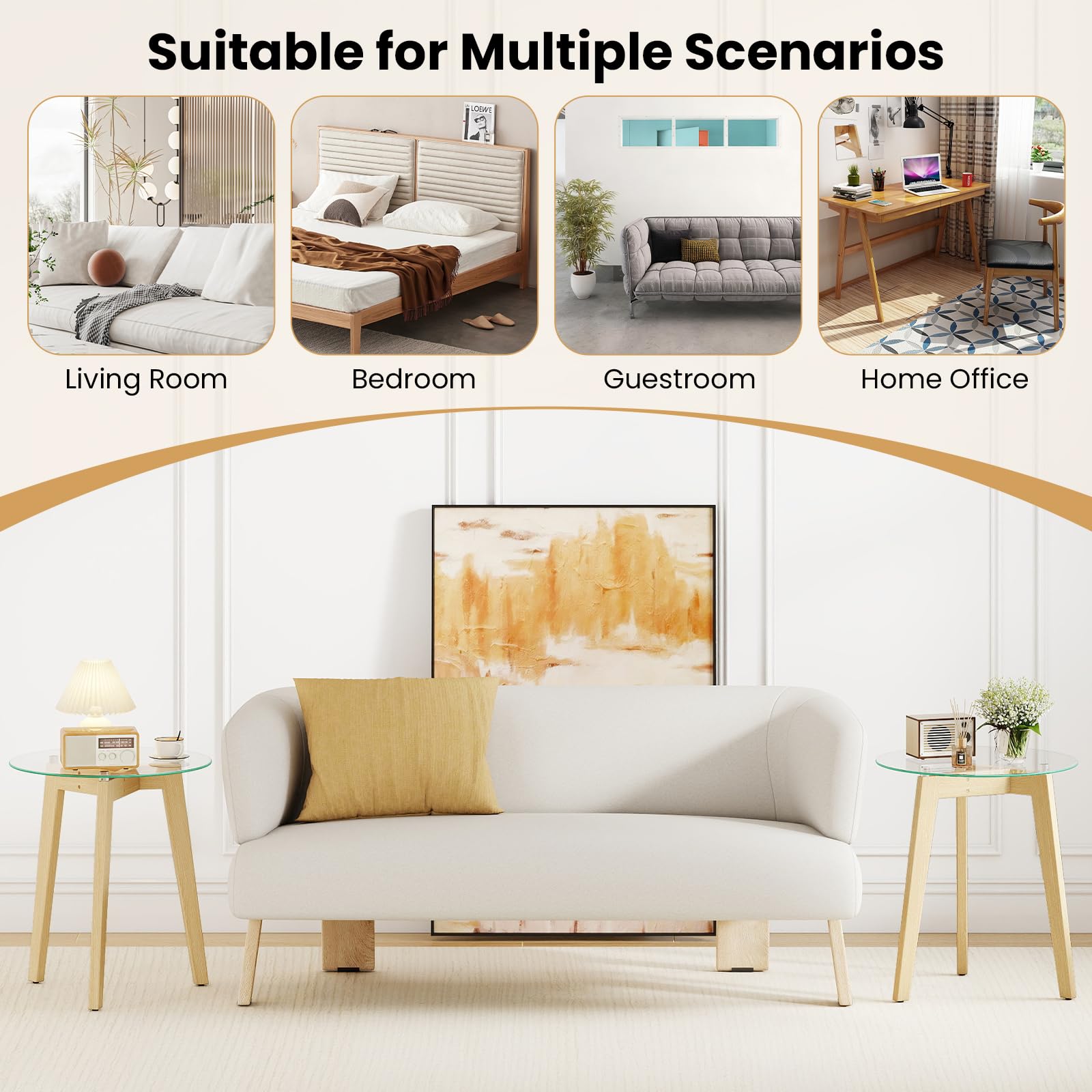 Perfect for diverse uses, the bedside table functions admirably as a chic nightstand, a stylish sofa table or an accent table in a guest room. Designed with a minimalist aesthetic, this versatile round side table features a premium tempered glass top, combining elegance with practicality. Plus, the scratch-resistant and easy-to-clean glass surface sits atop a solid rubber wood frame, adding stability and a contrasting charm to the delicate appearance. Additionally, the nightstand offers hassle-free assembly, allowing you to piece it together quickly and enjoy leisure time in your contemporary space timely.