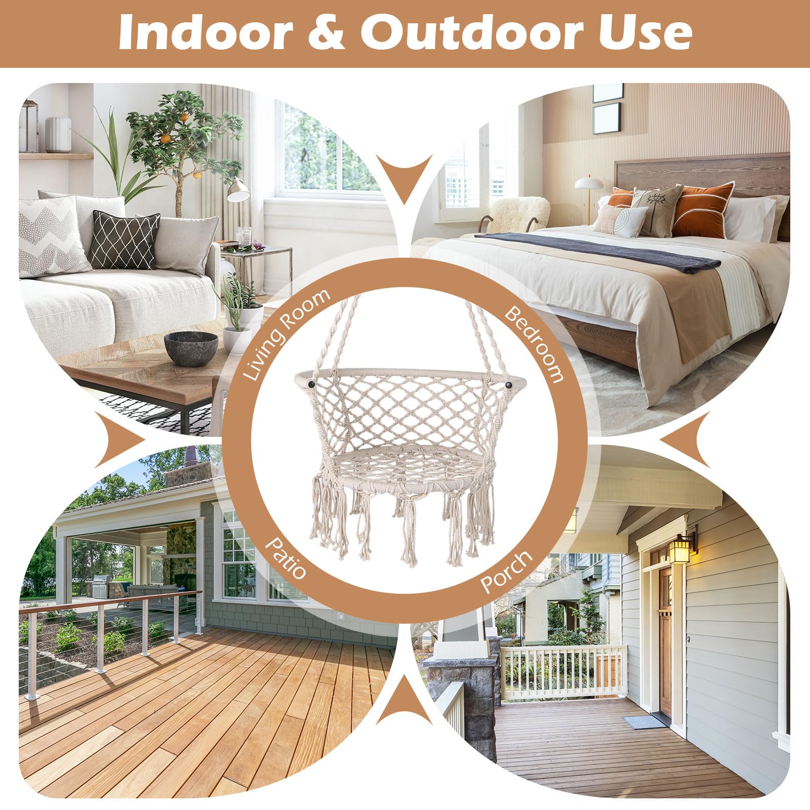 The hammock swing chair, with its stylish tassels and intricately woven seat, effortlessly blends fashion with comfort, making it ideal for reading, meditating, or simply relaxing. The versatility of this cotton rope swing chair allows for both 1-point and 2-point hanging options to suit your preferences. With sturdy metal rings and thick cotton ropes, the boho hanging chair is easy to set up straight out of the box. Weighing only 5.5 lbs and foldable, it is perfect for small spaces and can be easily moved around. Whether indoors or outdoors on your porch or balcony, this macrame swing chair is a charming addition to your space.