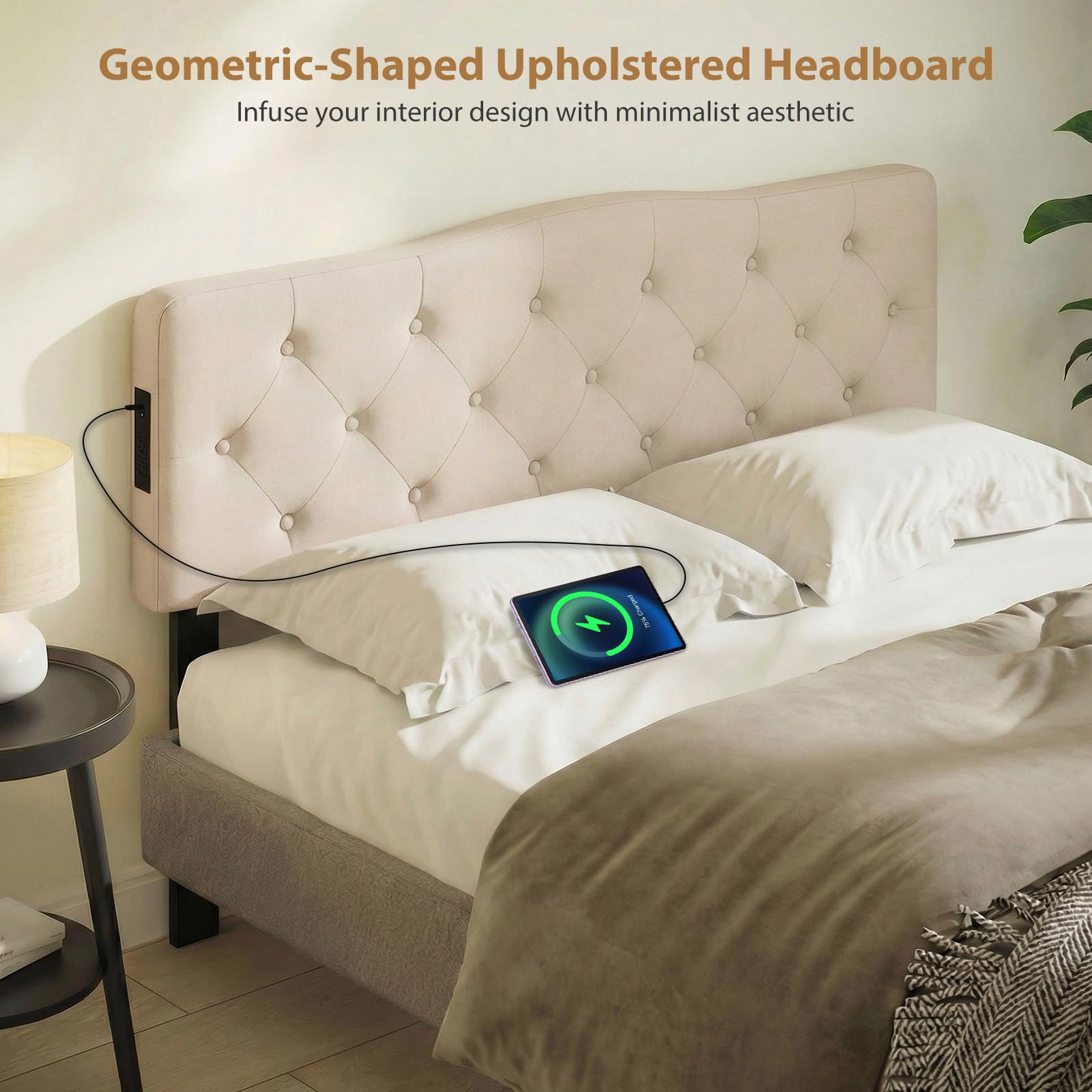 This modern upholstered headboard combines both style and functionality, featuring sturdy rubber wood legs known for their durability and crack resistance and a skin-friendly polyester fabric with elastic sponge filling for ultimate comfort while reading or lounging. Moreover, designed with elegant tufted aesthetics, this bed head board enhances diverse contemporary or minimalist bedrooms with striking clean lines. Practicality meets convenience with built-in charging stations including 2 AC outlets, USB and Type-C ports, allowing you to power multiple devices at once. Additionally, its adjustable width fits the full and queen-sized bed seamlessly while the pre-drilled leg holes ensure an easy and hassle-free assembly.