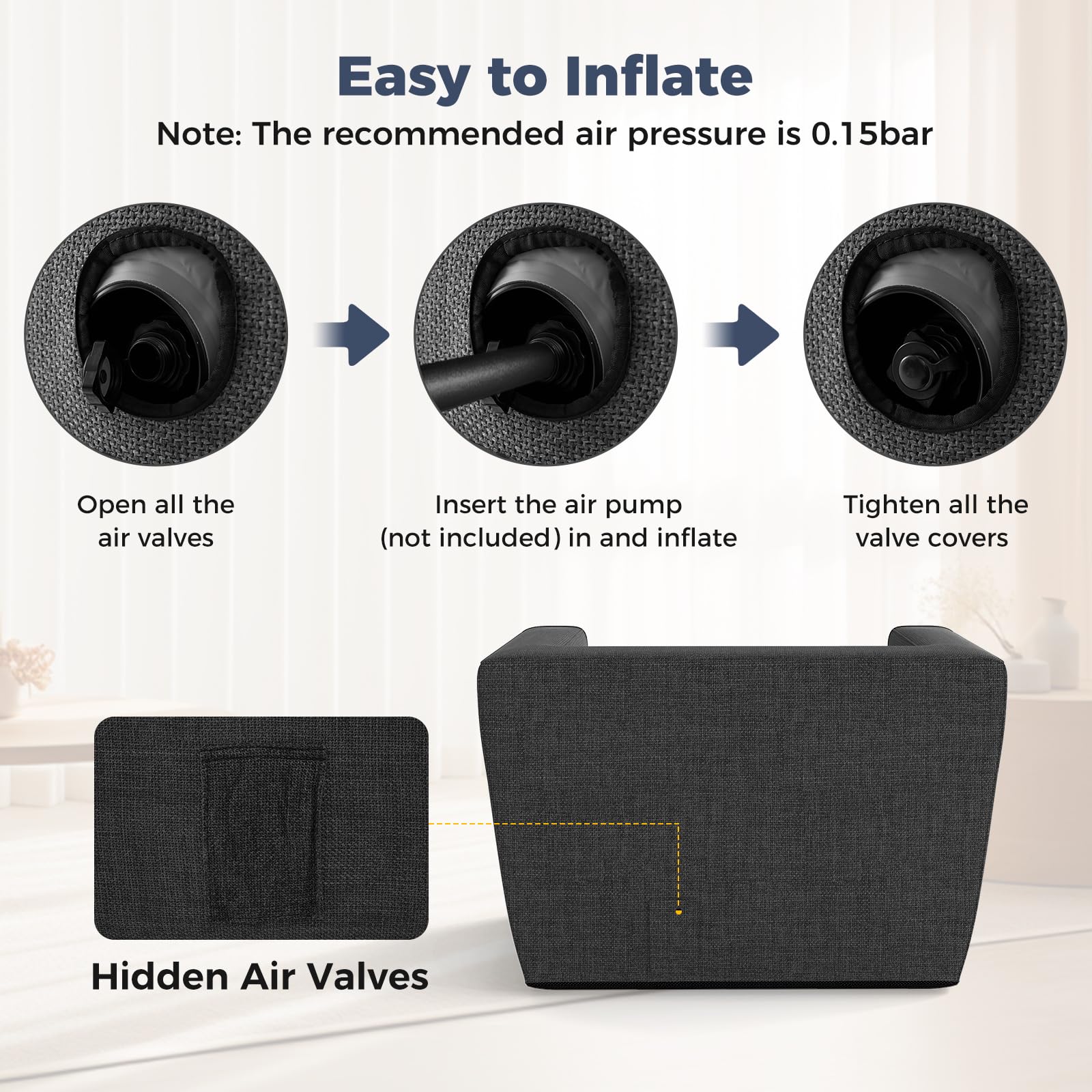 This ergonomic blow up sofa offers premium comfort and versatility. Its generous 53cm seating and 20cm wide armrests are crafted for optimal body support, ensuring your relaxation is both comfortable and supportive. When not in use, this single sofa can be deflated to a compact size, perfect for storage or transport. It is also ready to inflate in a few steps whenever you need a cozy retreat, ideal for various indoor settings. Additionally, it is built with premium PVC liners and a detachable cover that features wear-resistant and breathable fabric, designed for enduring use and easy cleaning. Plus, there is also an anti-slip base, ensuring reliable stability for your peace of mind.