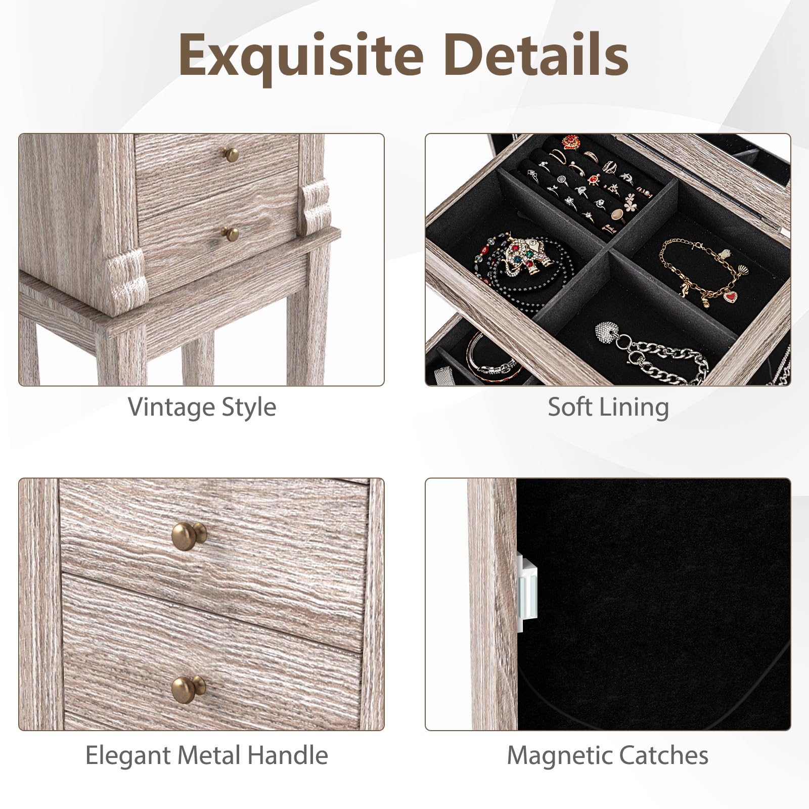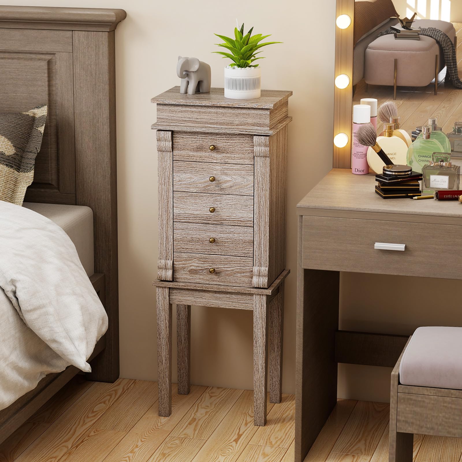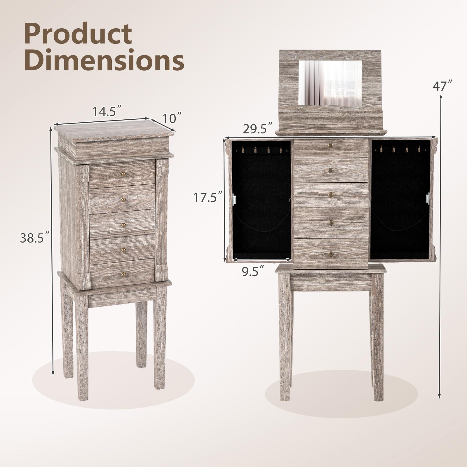 This jewelry cabinet provides spacious and elegant storage for all your jewelry and accessories. With 5 drawers, 2 side swing doors with 8 hooks, and a top flip mirror with divided organizers, it easily stores bracelets, watches, rings, necklaces, glasses, perfumes, and more. Its versatile design complements both modern and classic interiors.