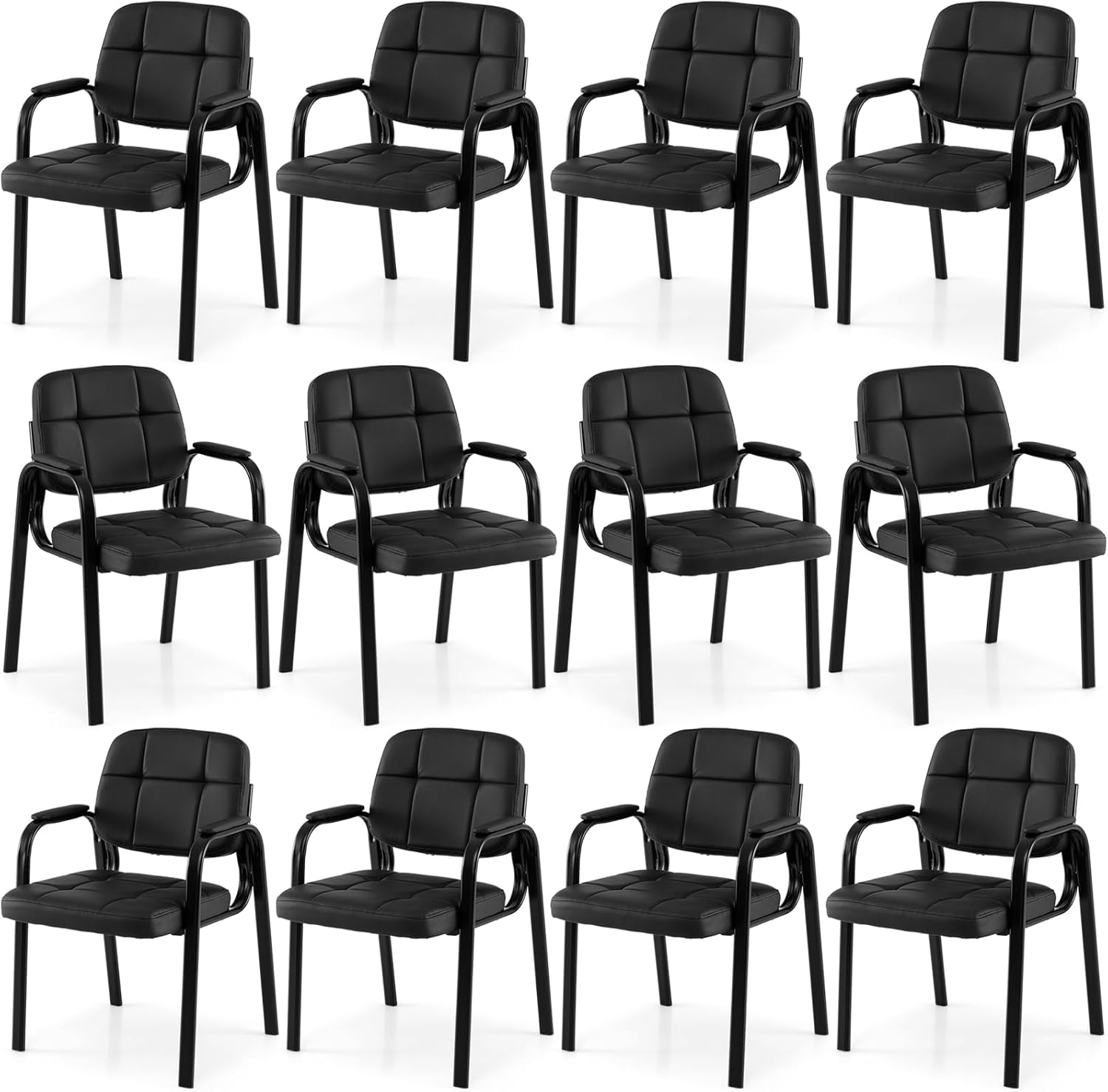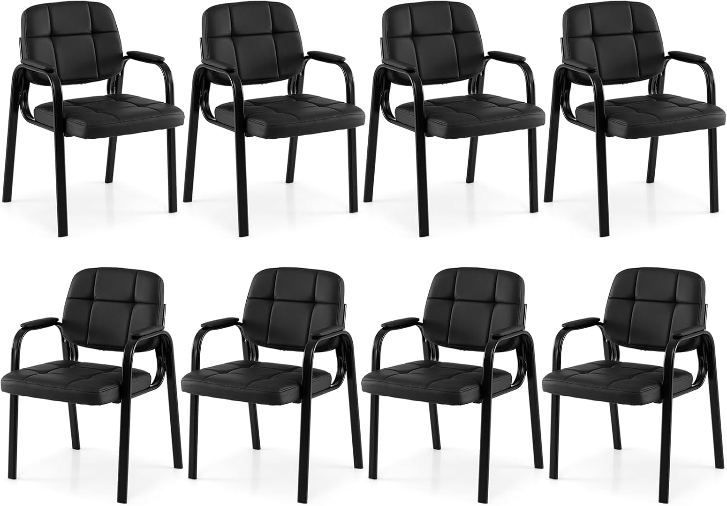 Featuring sponge-filled cushions and soft, waterproof PVC leather upholstery, it reduces fatigue while staying easy to clean. The ergonomic backrest and padded armrests provide excellent lumbar and elbow support. Built on a robust metal frame with non-slip foot pads, each office reception chair ensures stability and safety for up to 330 lbs. The sleek black finish and classic square stitching blend seamlessly into any professional or home environment, making these stationary leather chairs ideal for waiting rooms, reception areas, conference rooms, and home offices.