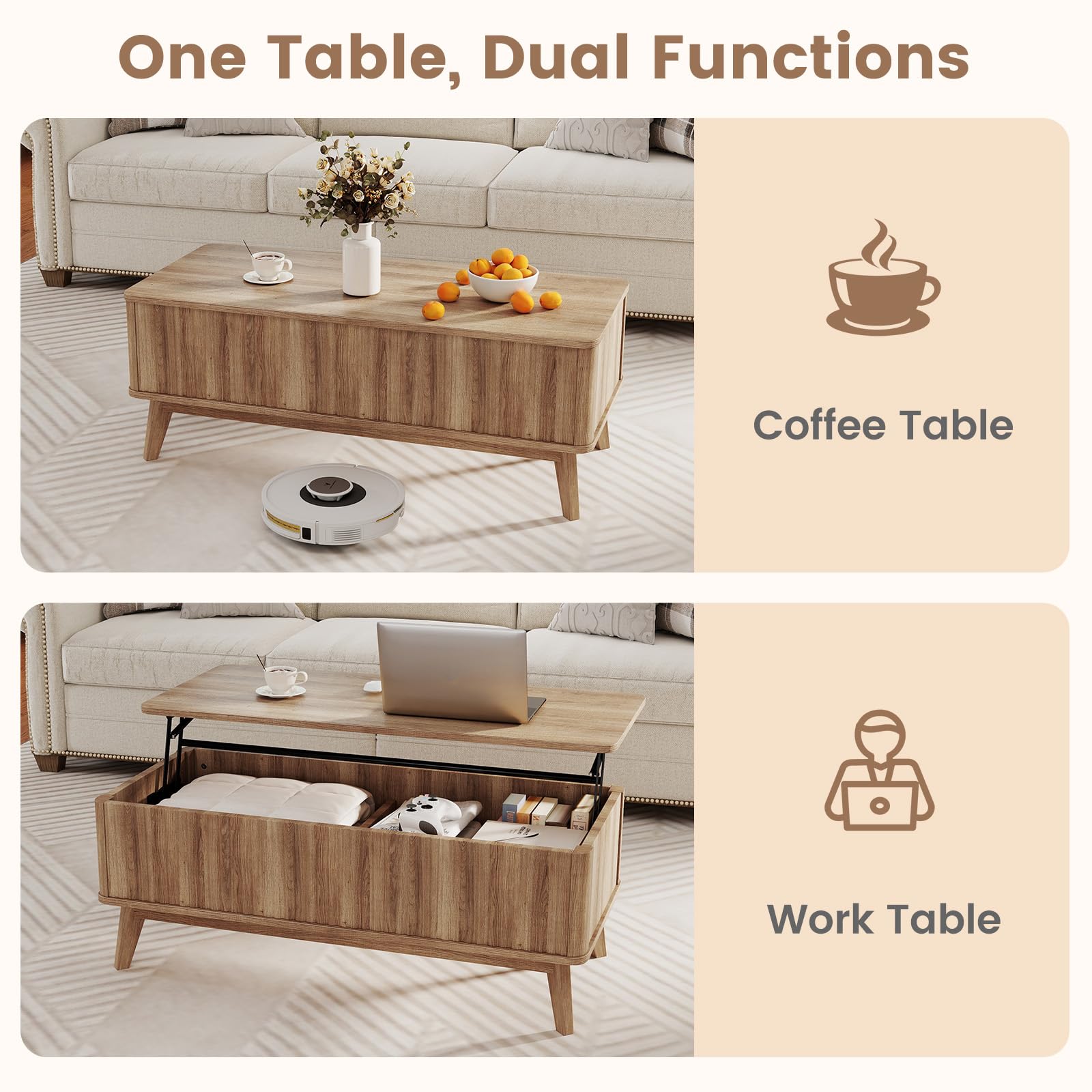 Elevate your living space with one table, dual functions that seamlessly blend modern design and practical use. This versatile lift top coffee table features a smooth lifting mechanism that transforms the piece from a classic coffee table into an elevated work table or dining surface. Spacious enough for everyday needs, it serves as your perfect storage organizer with a wide tabletop and 2 hidden compartments. Highlighting well-made details, its sleek mid-century fluted design adds a tasteful retro charm that complements various decoration styles. Built with sturdy rubber wood legs, it supports up to 200 lbs on top and 180 lbs inside each compartment, with protective foot pads to prevent floor scratches. Measuring 43.5"/35.5" long, this adaptable lift top center table fits effortlessly in living rooms, home offices, or studies, combining style and dynamic functionality for modern households.