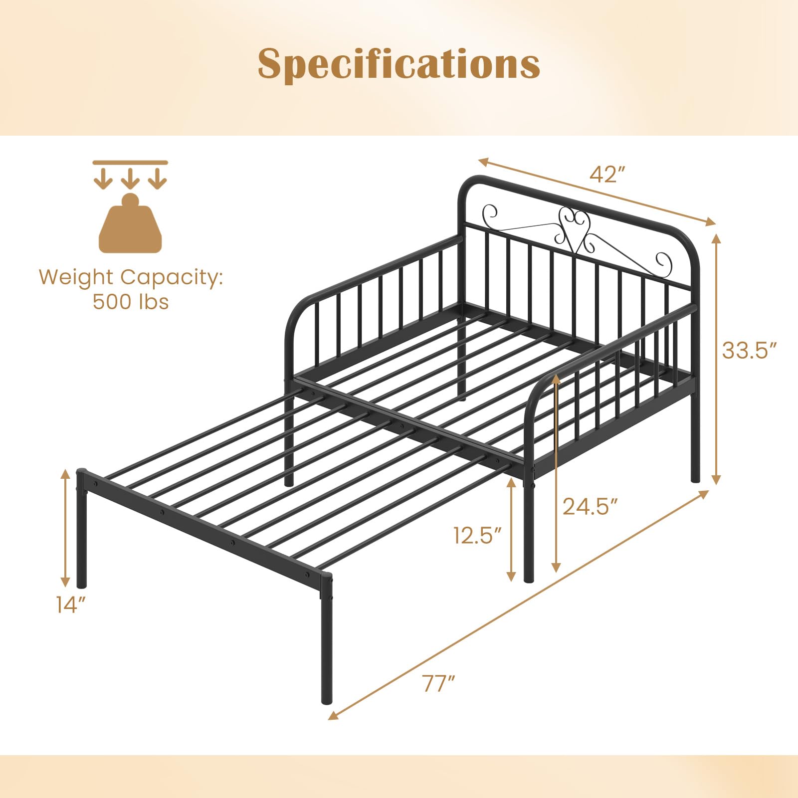 This convertible sofa bed is the perfect space-saving solution for any home, seamlessly transforming from a cozy sofa during the day into a comfortable twin-size bed at night. Ideal for small spaces, this twin bed frame is perfect for sleepovers or hosting guests. The heavy-duty metal frame and powder-coated metal slats offer exceptional durability and sturdiness, supporting up to 500 lbs. The elegantly carved guardrails and integrated armrests not only enhance the aesthetic appeal but also provide added comfort and safety. With 12.5 inches of under-bed clearance, you'll enjoy plenty of storage space for bedding, seasonal clothing, or books. A twin size folding sofa mattress or a regular twin size mattress with a thickness of 4"-8" fits perfectly, and assembly is quick and easy, making this retractable daybed the perfect addition to your living space.
