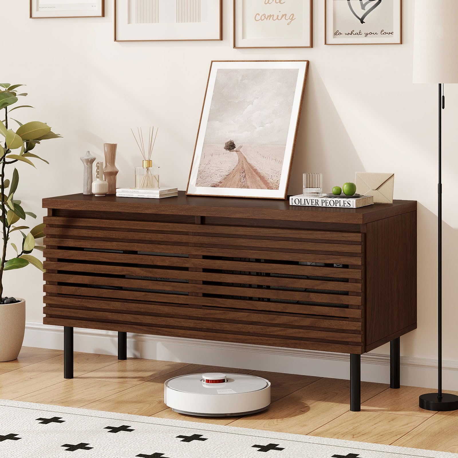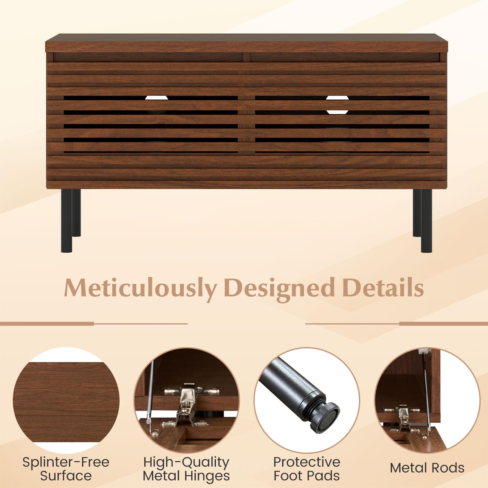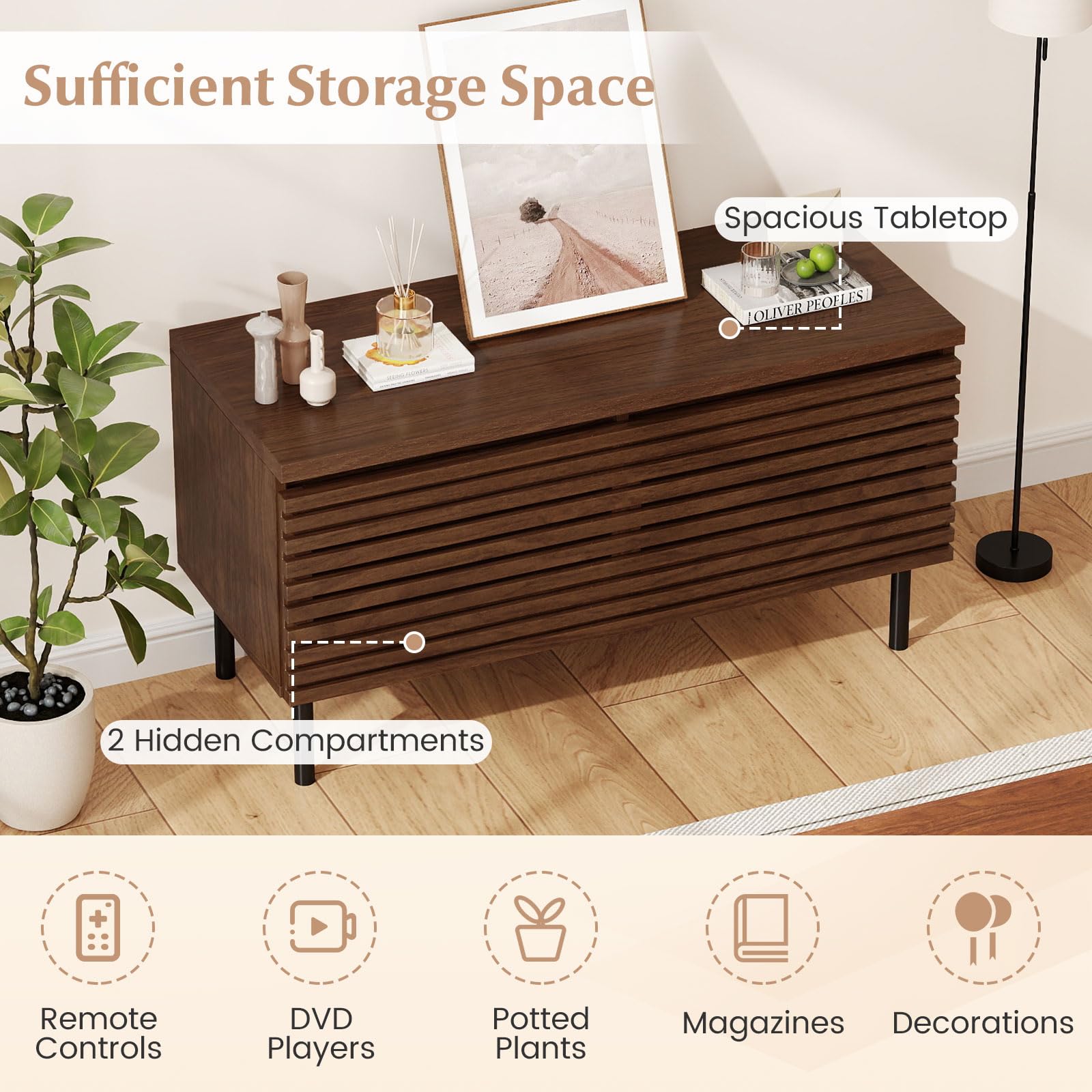 Sized at 35.5" x 15.5" x 19", the TV stand is perfect for TVs up to 40 inches and fits well in smaller spaces. Plus, this retro-inspired TV console combines mid-century charm with modern functionality, featuring a fluted design that adds elegance to your living room or bedroom. Crafted from high-quality wooden boards and supported by sturdy metal legs, this entertainment center offers exceptional durability. Moreover, the console table offers ample storage space, including a spacious tabletop and 2 hidden compartments, keeping your media essentials organized and clutter-free. Thoughtful cable management with 2 hidden holes ensures a neat and tidy entertainment area.