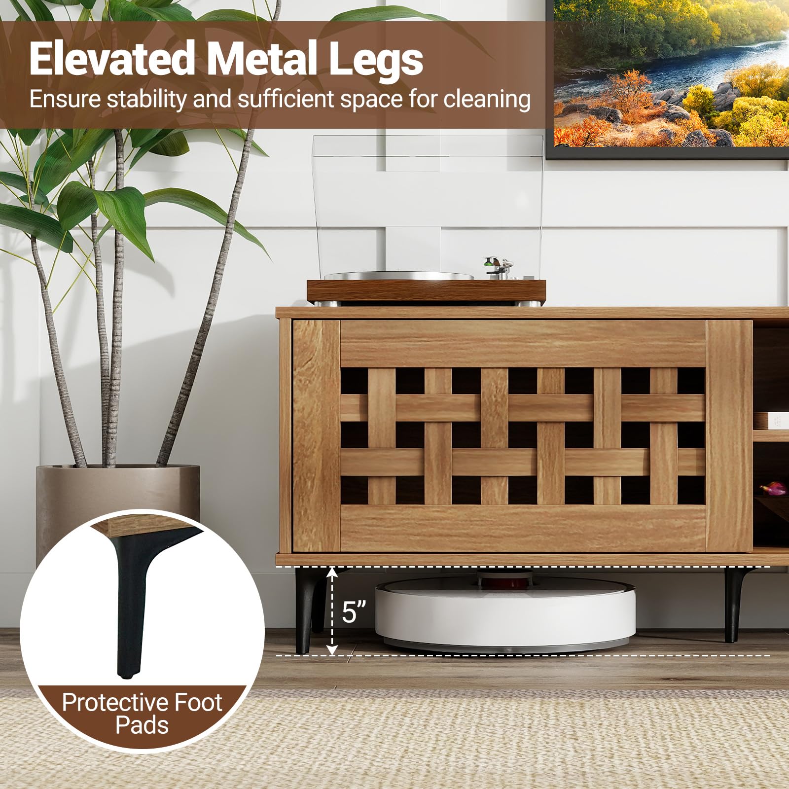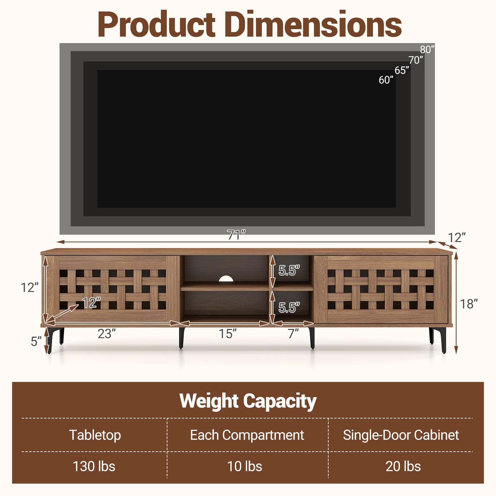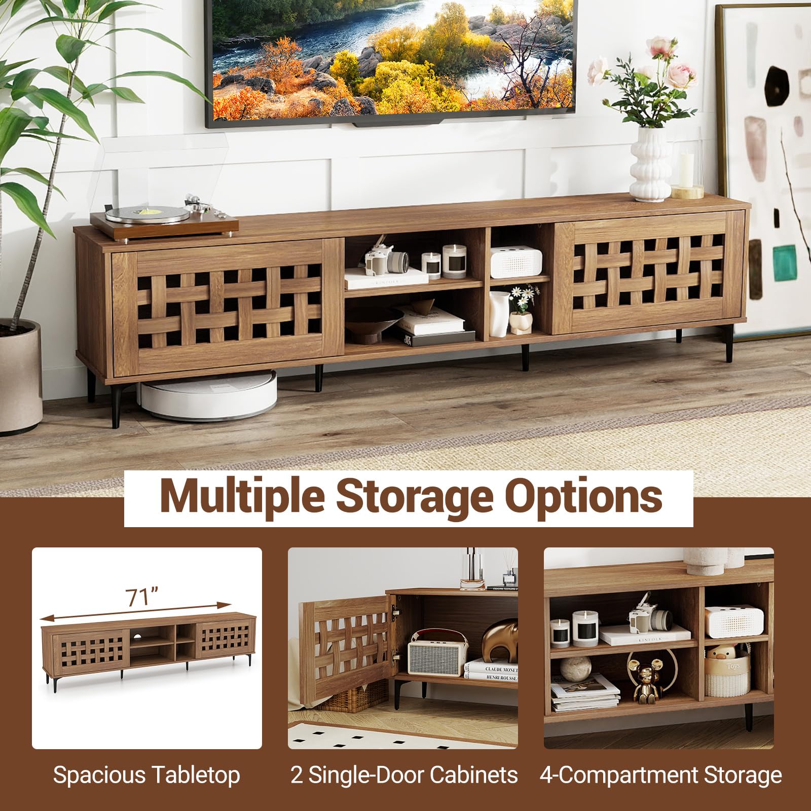 This stylish media console is crafted from solid wooden board with elevated metal legs for stability and easy cleaning. Plus, the console table features a unique cut-out pattern that adds a striking focal point to the interior. Designed to accommodate TVs up to 80", the entertainment center offers a spacious tabletop, 2 single-door cabinets and 4 open compartments with cable management hole to keep your electronics organized and cables tidy. Moreover, the versatile design makes it perfect not only as an entertainment center but also as a functional storage or display unit in the living room, hallway or bedroom, effortlessly blending with your decoration.