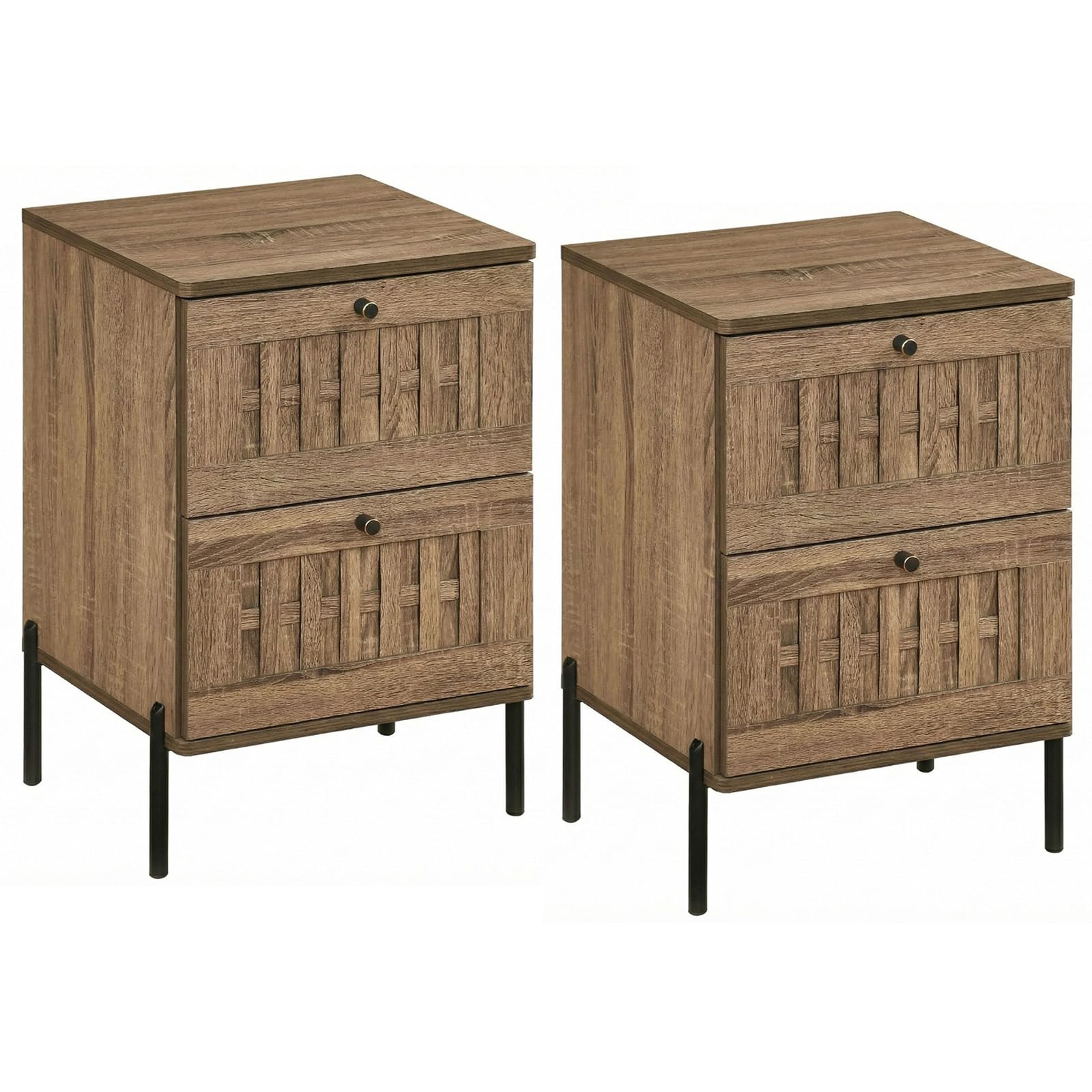 Upgrade your bedroom with this eye-catching 2-drawer nightstand, featuring a striking, handcrafted woven front that sets it apart from ordinary furniture. Its generous tabletop easily hosts lamps and books, while deep drawers keep clutter out of sight. Supported by sturdy, elevated metal legs with anti-slip pads, this piece makes cleaning underneath a breeze and protects your floors. You’ll love the low-maintenance, easy-clean finish and the smooth-glide drawers, while thoughtfully rounded corners ensure safety. Designed to fit snugly into small spaces, this versatile side table is perfect beside your bed, sofa, or even a workspace, blending mid-century charm with practical storage to elevate any room. Add a touch of artistry and smart organization to your home today!