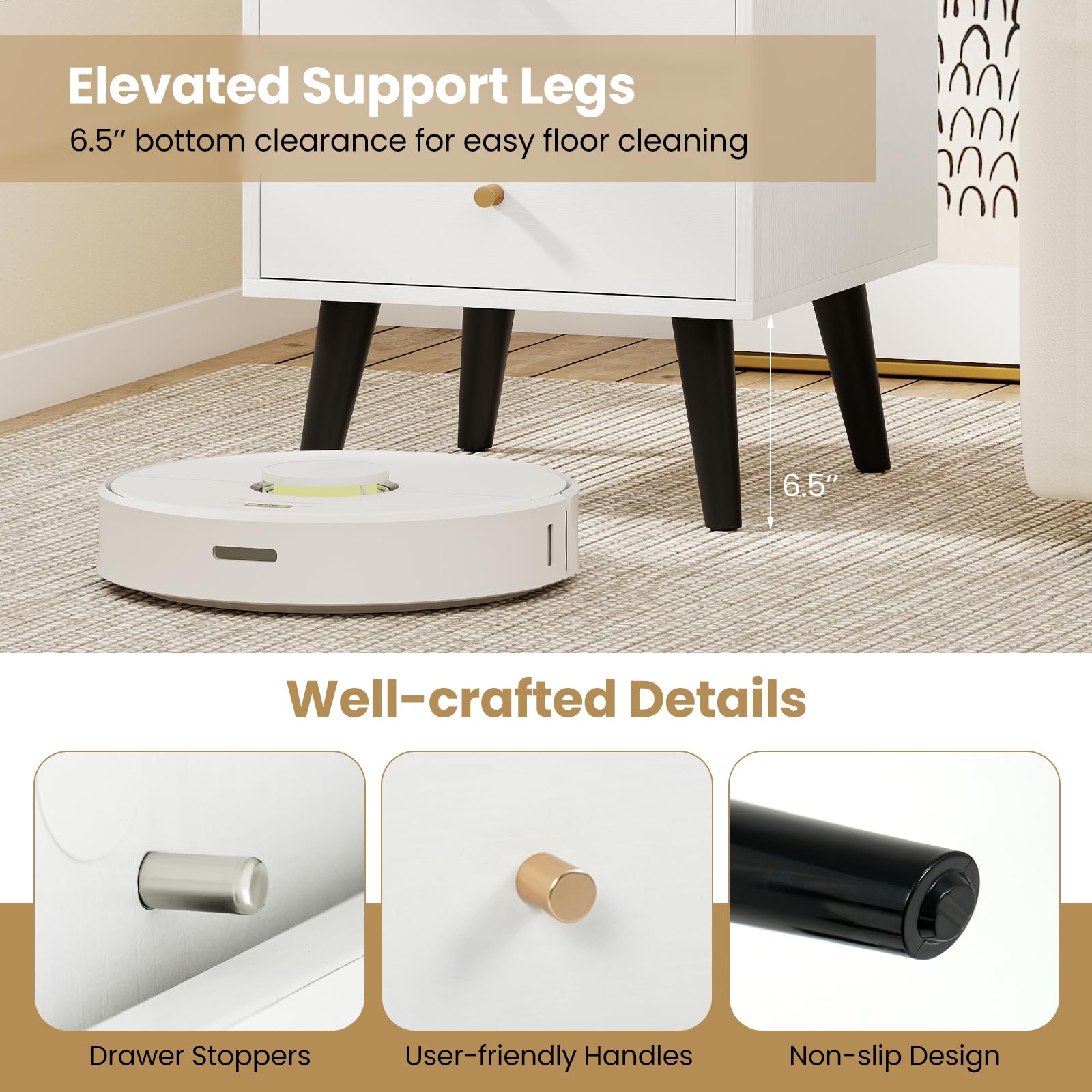 6.5” bottom clearance for easy floor cleaning