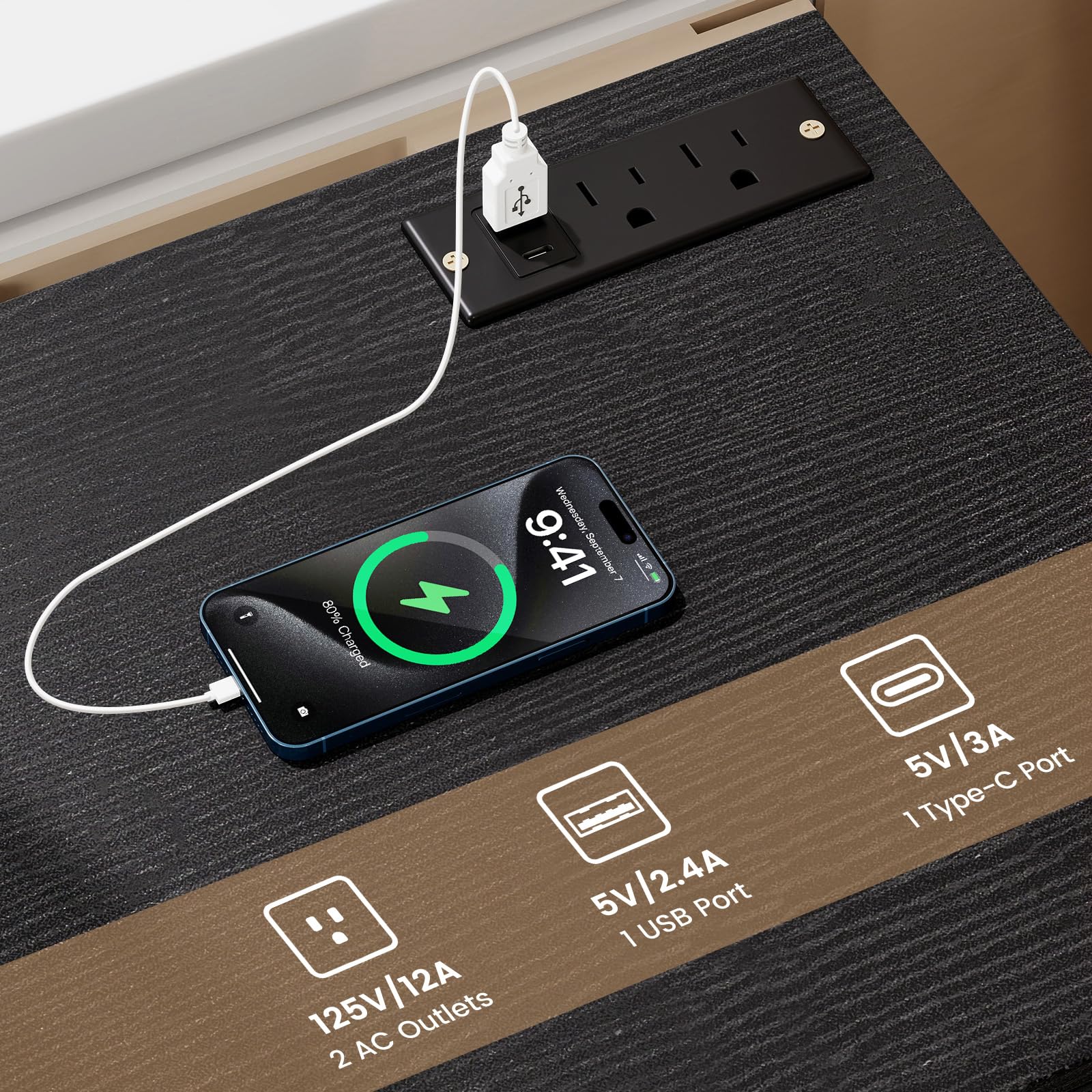This side table is crafted from sturdy engineered wood and equipped with anti-toppling devices, ensuring both safety and long-lasting stability. It features a built-in charging station with 2 AC outlets (125V/12A), 1 USB port (5V/2.4A) and 1 Type-C port (5V/3A), providing a convenient way to power your devices without clutter. The 3 pull-out drawers keep various items neatly organized and out of sight, while smooth metal slides and easy-to-grip handles make drawer operation effortless. Additionally, its sleek design adds an elegant touch that complements both bedroom and living room decoration.