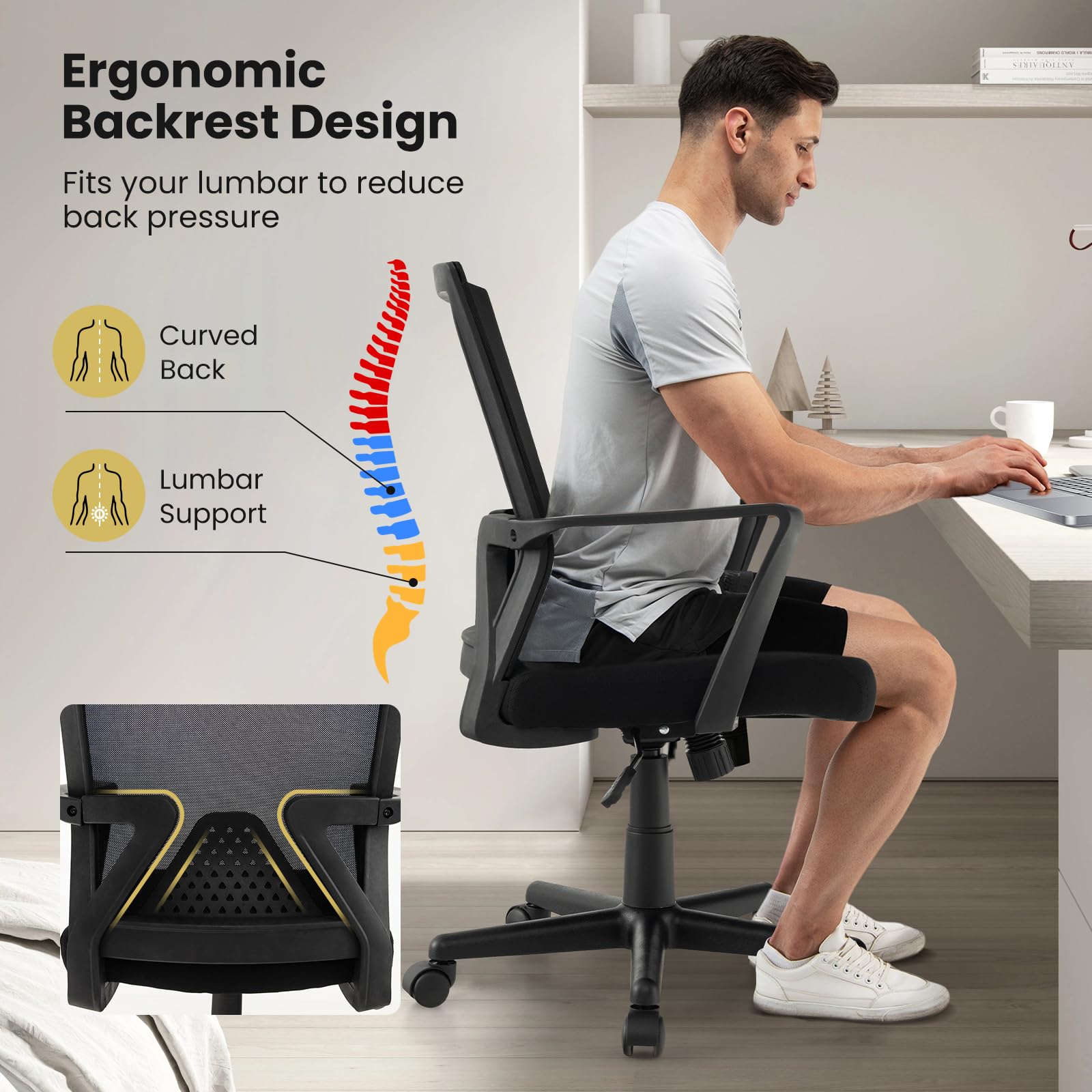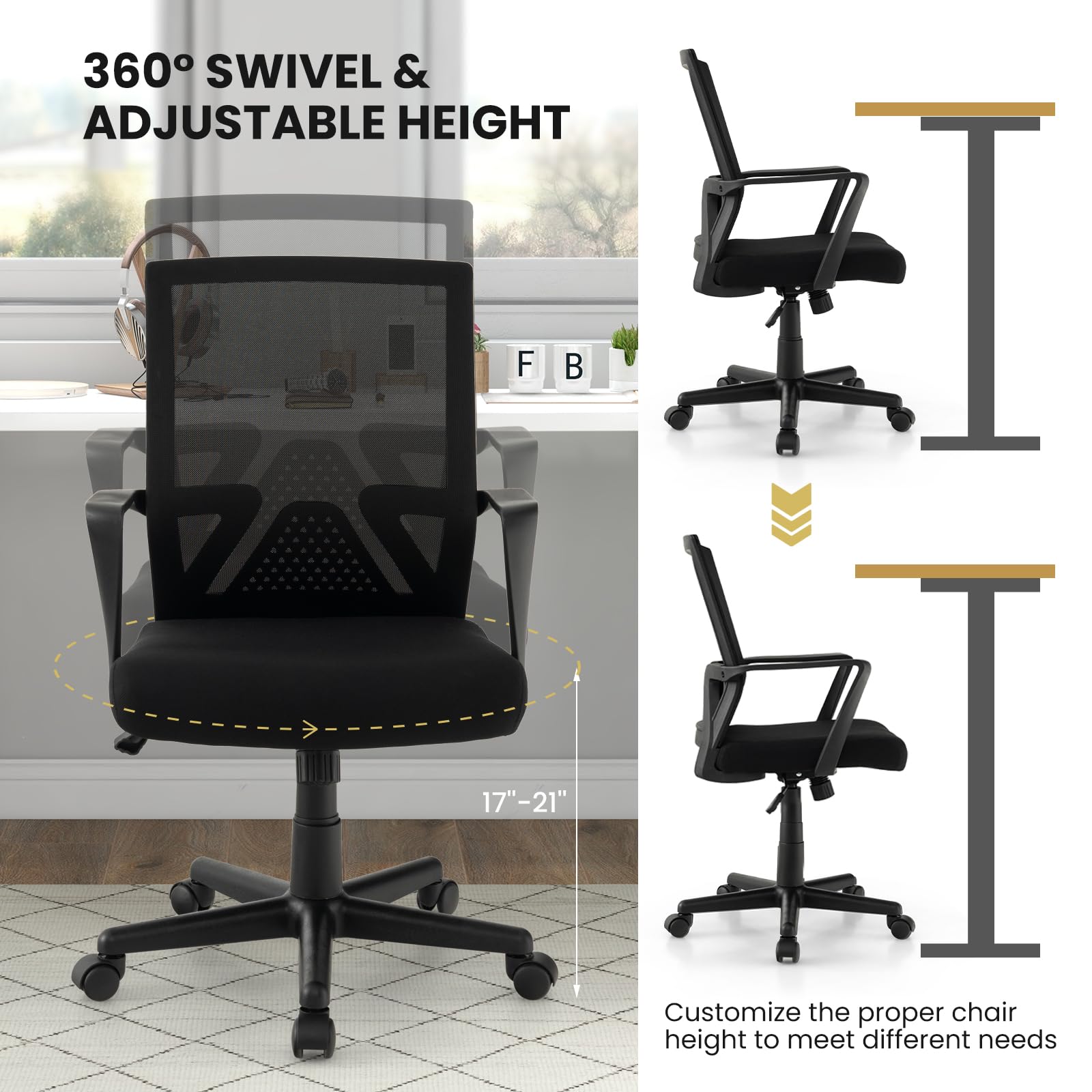 The home office chair is designed to provide both comfort and ergonomic support for long hours of sitting. Its ergonomic design features a curved high back, comfortable armrests and a cushioned seat, ensuring proper posture and reducing the risk of back pain or discomfort. The adjustment lever is designed to be pulled out to turn on the rocking function and pushed in to turn off the rocking function. The tension control knob is also designed for adjustment. Turn clockwise to loosen and turn counterclockwise to tighten. With a rocking function, users can enjoy moments of relaxation, and the 360° swivel and adjustable height options allow you to customize the proper chair height to meet different needs. The task chair utilizes selected materials for more comfort, built with a solid and stable construction, ensuring durability and longevity. Equipped with universal casters, it allows for effortless movement across different floor surfaces, making it convenient for users to access various areas of their home office.