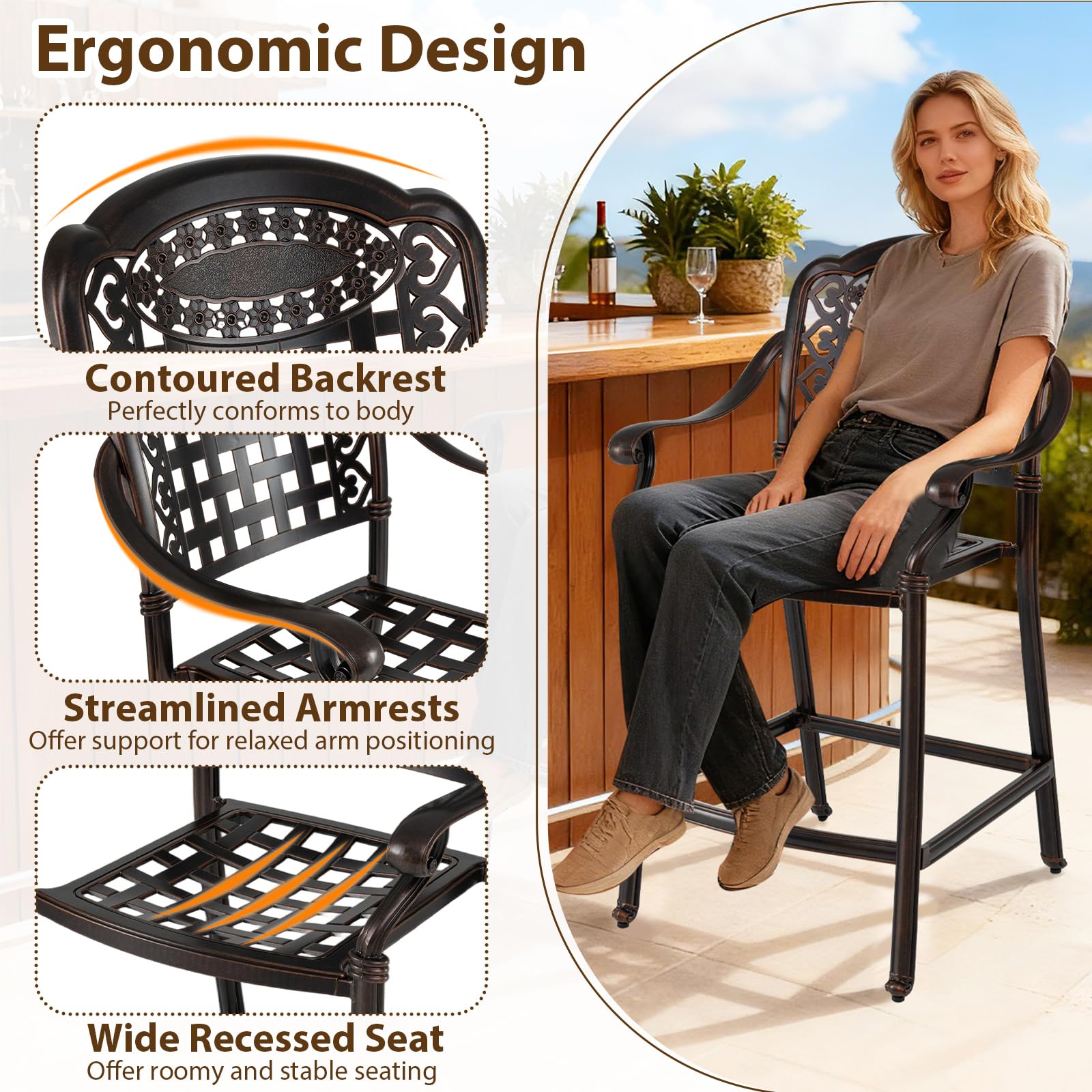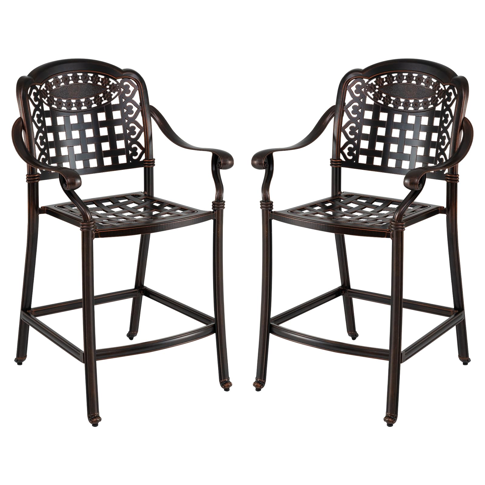 Bring comfort and character to your outdoor gatherings with this cast aluminum bar stool set. Designed for both charm and strength, each chair features a curved seat, supportive backrest, and flowing armrests that encourage relaxed sitting for hours. The artistic floral detailing and antique copper finish reflect classic outdoor elegance, easily blending with any garden, deck, or porch style.