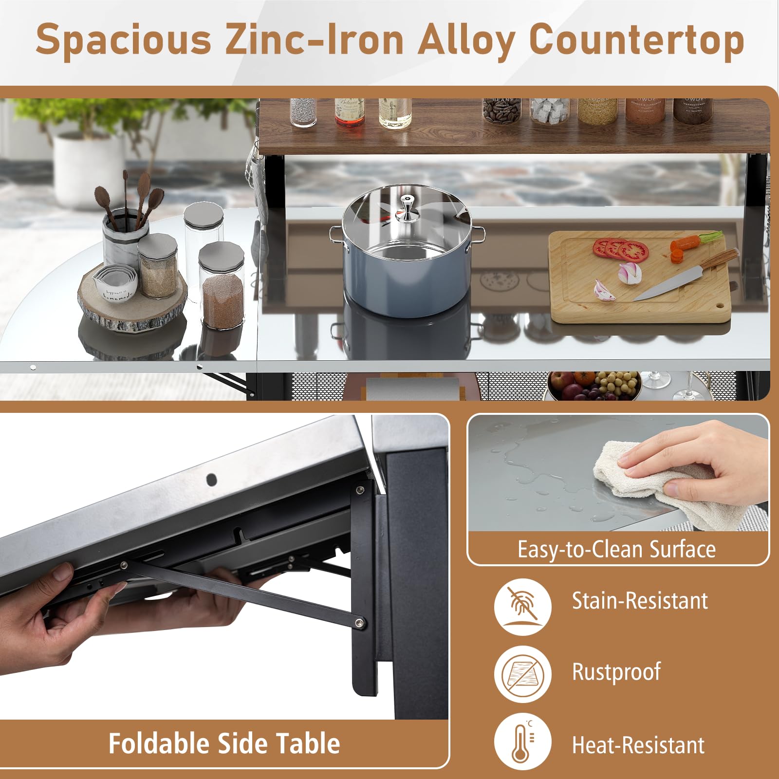 Featuring 4-tier storage, 6 removable hooks, a paper towel holder, and a cylinder hook for propane, it keeps all your grilling essentials organized and within reach. The flip-up top instantly transforms into a stylish bar, while the foldable side table adds extra prep space when needed and folds away to save space. Made with rustproof zinc-iron alloy tabletops and a sturdy galvanized metal frame, it offers long-lasting durability and stability with adjustable foot pads. Perfect as a grill table, food prep station, bar table, or kitchen island for patios, backyards, gardens, poolside areas, or indoor spaces.
