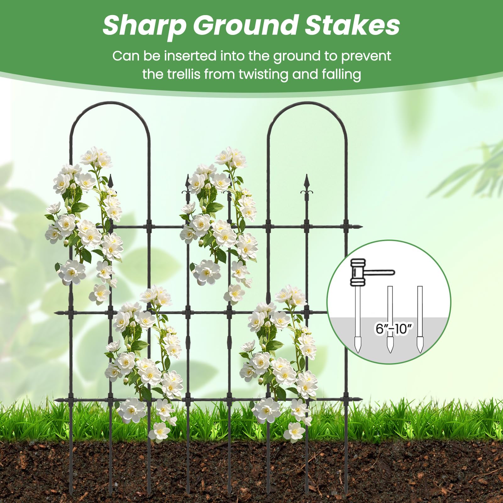 - [Wind-proof Design]: This garden trellis is equipped with sharp ground stakes, which are designed to be easily inserted into the soil, ensuring that the structure remains steadfast against the wind. These stakes also prevent the trellis from twisting or falling, providing a solid base for your climbing plants.