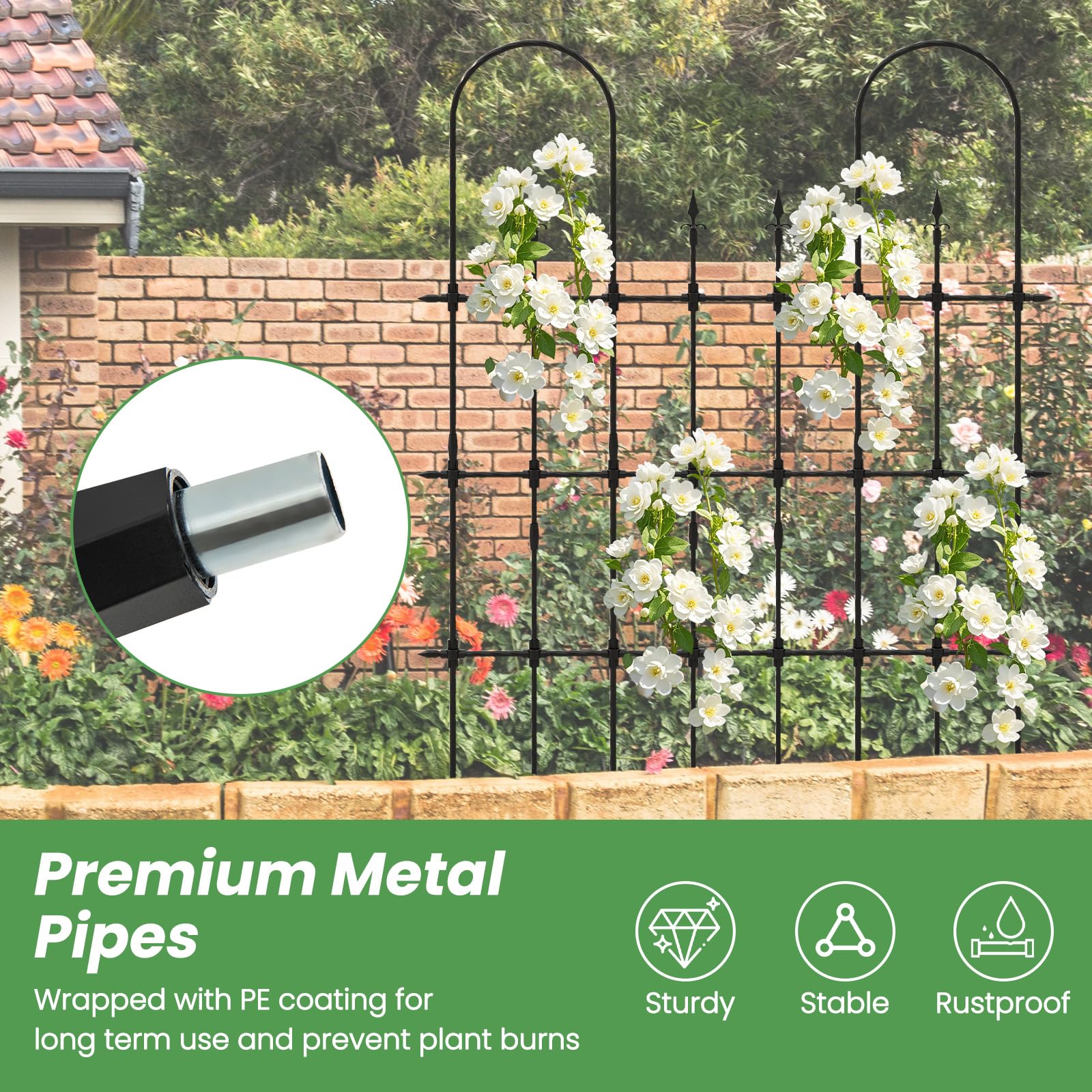 - [Premium Metal Pipes]: Constructed from sturdy metal pipes, this elegant trellis is stable and reliable for long-lasting outdoor use. Besides, the PE coating not only makes it rustproof but also prevents plant burns, providing a good living environment for your plants.