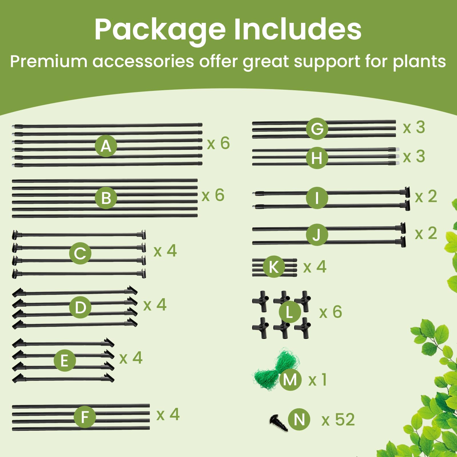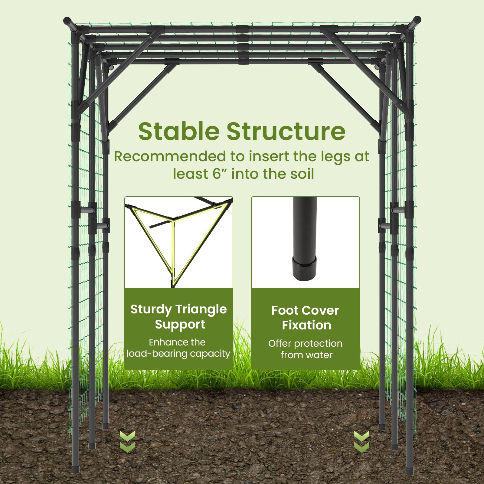 The 79" x 59" x 78" (L x W x H) large garden arch trellis with netting offers generous support for plants to thrive, enriching the vitality of your garden space. Compared to others that are easy to rust, ours is crafted from metal tubes encased in protective PE plastic coatings. Therefore, the metal arch is engineered to endure the outdoor elements. Considering that high temperature is not conducive to the growth of plants, the selected PE coating is heat-resistant for healthy plant growth. Furthermore, the innovative framework not only functions as a sturdy plant support rack for cucumbers, melon vines or grapes, but also serves as an arch for garden or backyard decoration. For reliable stability, the foot legs are recommended to insert the legs at least 6"/ 15 cm into the soil.