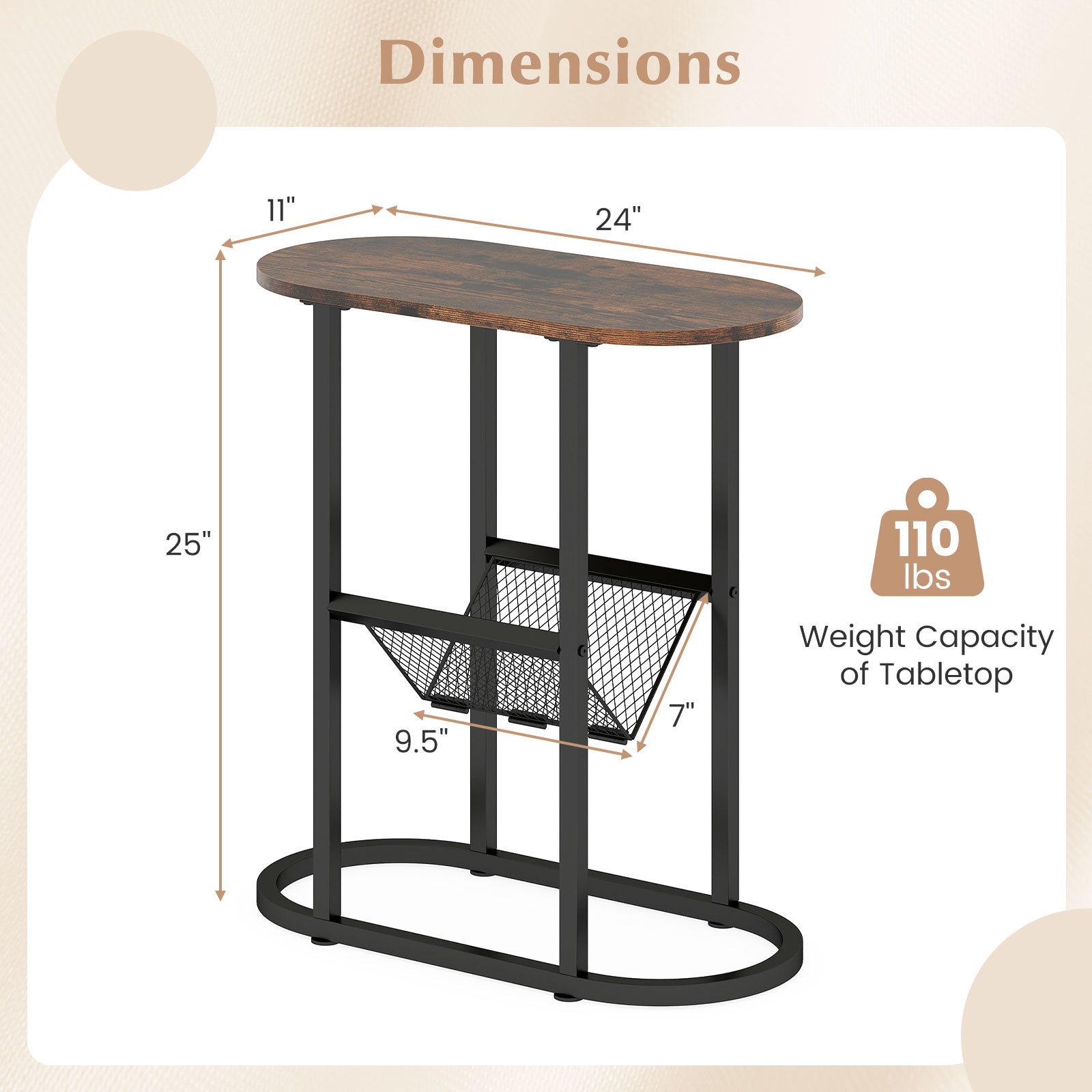 Discover the perfect space-efficient solution with our stylish, narrow side table. Perfect for tight spaces at 24” x 11” x 25”, it elegantly fits wherever you need it – next to your cozy sofa or as a charming nightstand. Say goodbye to bumps and scrapes with its rounded oval design. This isn’t just a table; it’s a statement piece with its V-shaped magazine rack and robust metal frame, designed to support up to 132 lbs and endure over time. The stylish finish injects a dose of sophisticated into any setting. Don’t let a cramped space cramp your style – elevate your home with this multi-functional, exquisite piece of furniture today!