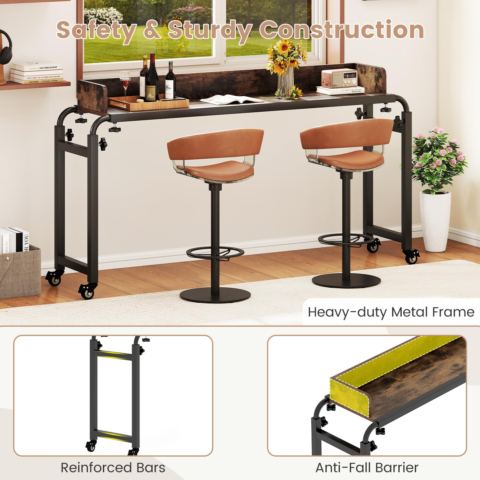 With adjustable height (29"–40.5") and length (53.5"–81"), the desk easily fits different bed sizes and user preferences, providing personalized comfort. Four 360° rolling wheels ensure smooth movement across any surface, while the lockable design keeps the desk steady during use. The spacious tabletop offers ample room for daily essentials, and its 4" raised edge prevents items from slipping off. Built with a heavy-duty metal frame and reinforced boards, this table delivers long-lasting strength and stability—perfect for bedrooms, living rooms, and home offices alike.