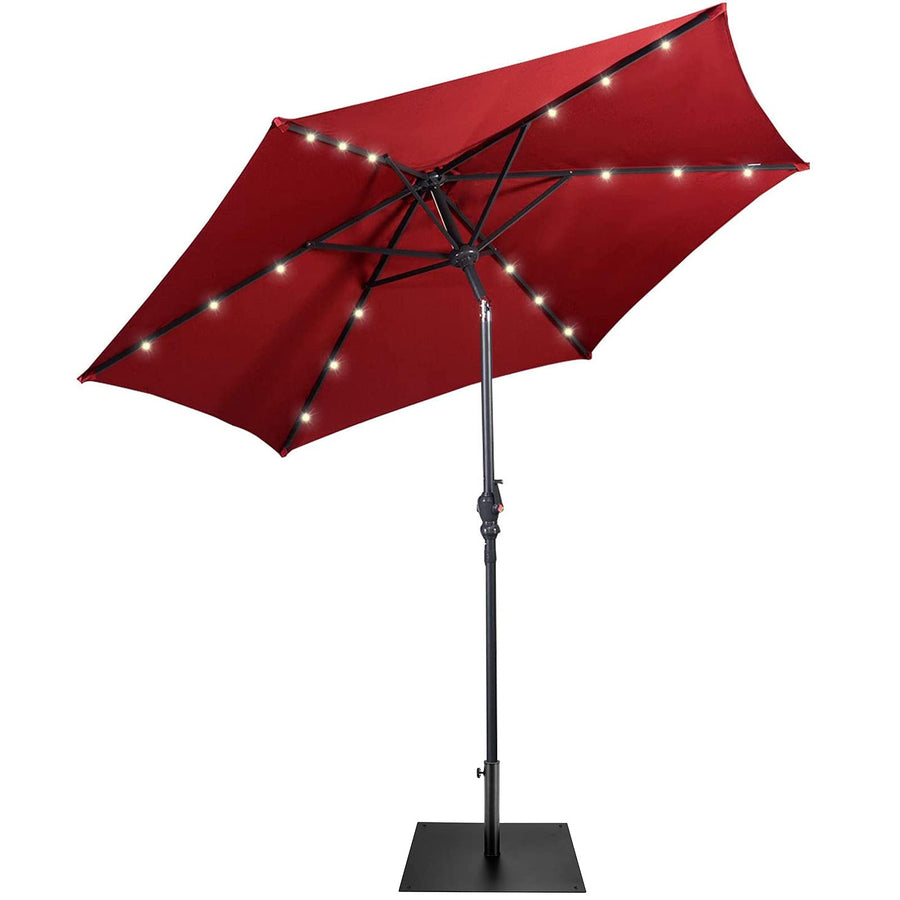Designed with modern appearance, it will be a perfect addition whether for family or commercial. It can be used in all weather with the large umbrella cover of 9'' to resist both UV and rain. As it is tilting, there is no illumination discomfort. Combined with the crank lift system, it will be much easier to use. The top solar panel will store energy during the day so that you can use it at night. With the soft LED flame, the umbrella renders a romantic atmosphere for you to spend a great night. And a 40lbs umbrella stand can keep the umbrella stable when using it.