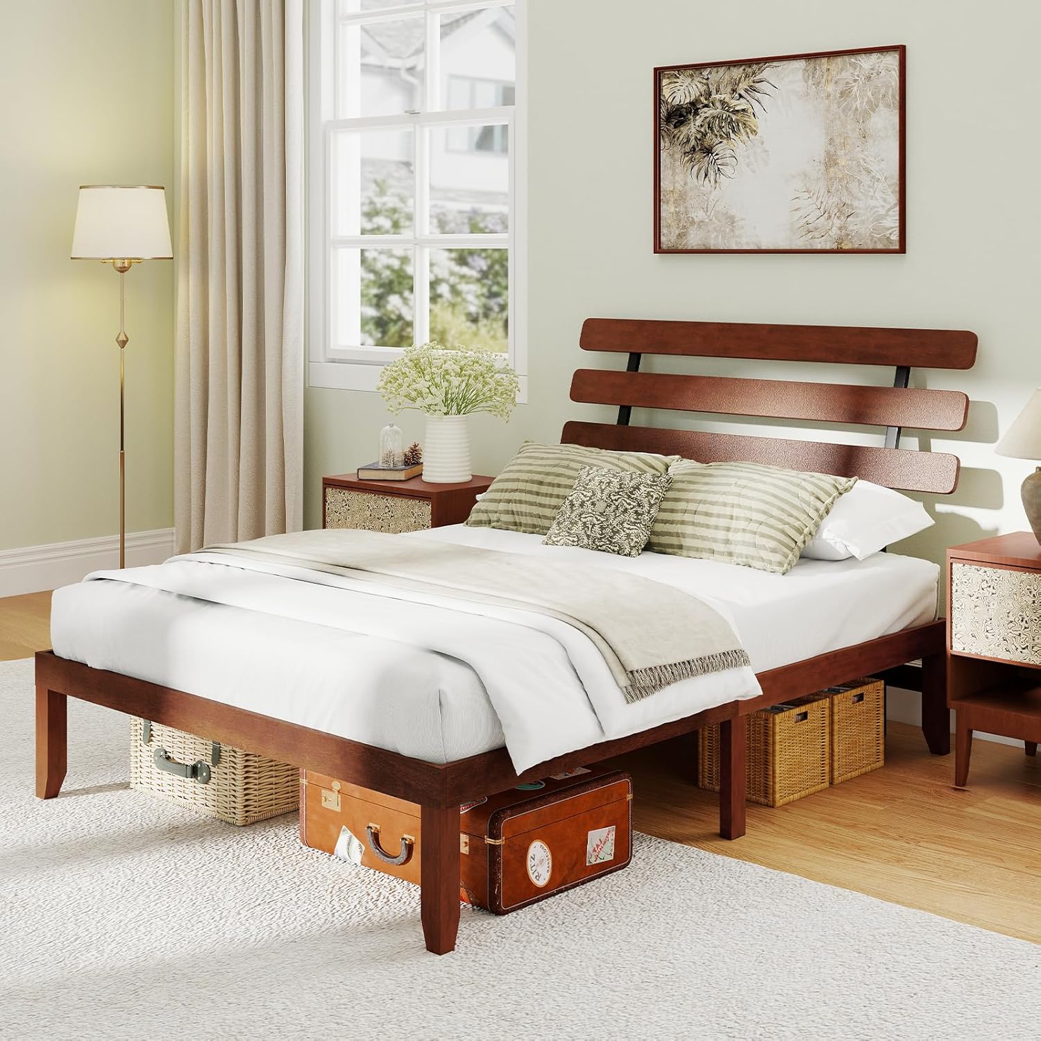 The retro headboard with a gentle slope easily fits into different bedroom designs while providing comfortable back support. Made from solid wood with an appealing grain texture, this bed frame combines strength and style. Moreover, it incorporates strong wooden slat system and middle support legs which evenly distribute weight. Additionally, the spacious under-bed storage simplifies organization and cleaning. Overall, this wooden platform bed brings charm and nostalgia to any room.