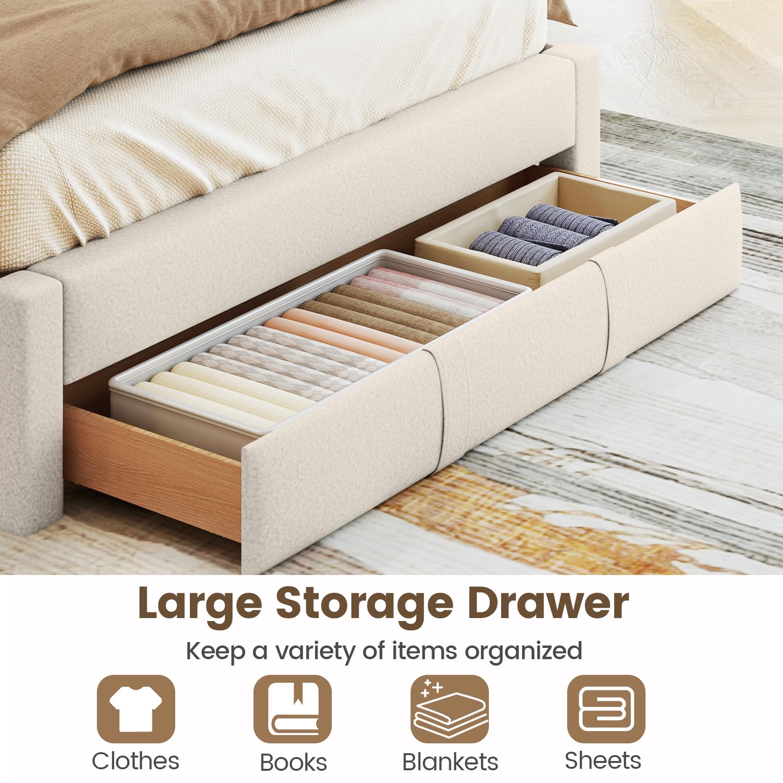 The queen size bed frame with drawer provides a practical storage solution for a variety of items, helping maintain a clutter-free and organized space. Featuring modern vertical channel headboard, the bed frame serves as a chic aesthetic centerpiece while providing substantial support for reading or relaxing. For restful night's sleep, the wooden slats ensure a reliable mattress foundation. Additionally, the middle support legs offer great stability. For storage convenience, you can optimize bedroom space with ample under-bed clearance. This upholstered platform bed not only adds a touch of elegance to your bedroom but also offers a cozy and tactile experience.
