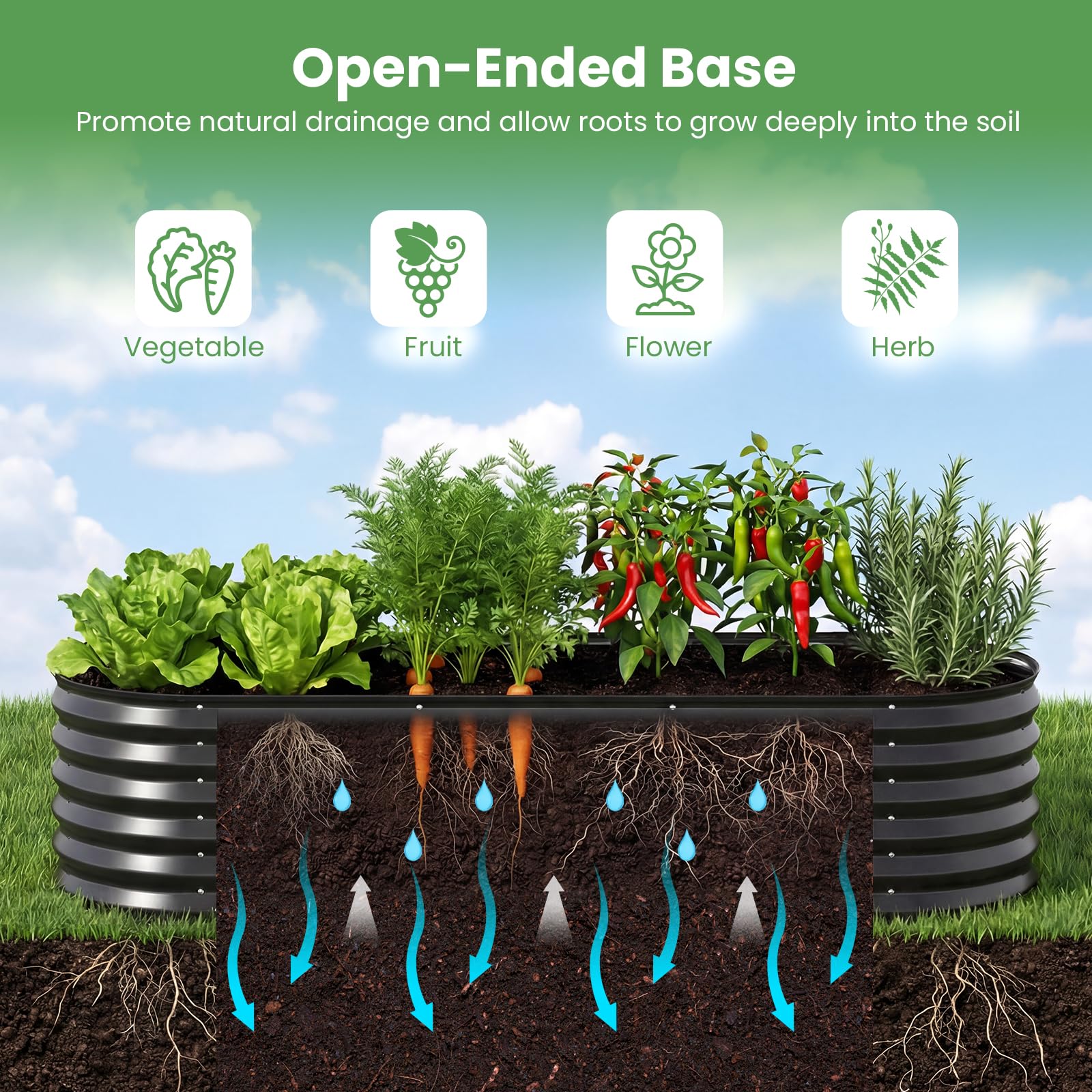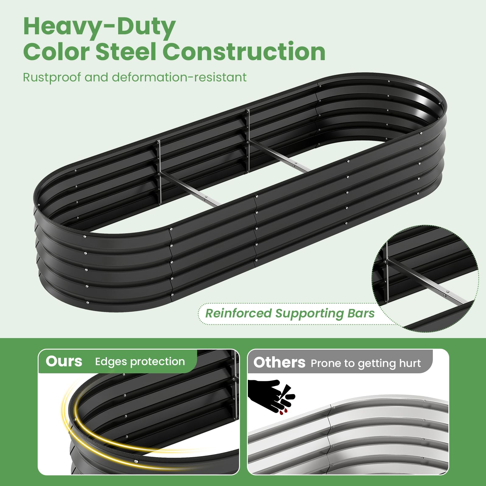 This 3-in-1 design combines a raised garden bed with a garden greenhouse cover, creating a practical setup that supports winter protection and open-air summer planting with a quick tool-free transition. Made from premium color steel, the metal garden bed offers rust-resistant durability, paired with reinforced support bars for enhanced strength, and protective edges that help make everyday gardening feel sturdier and safer. The open base of the raised planter promotes natural drainage and deeper root growth, while the extended cover edges can be buried or weighted for added outdoor stability. With generous room for vegetables, flowers, herbs, fruits, and seedlings, this garden bed with greenhouse cover also includes a large roll-up zippered window that improves ventilation and makes plant care easier throughout the season.