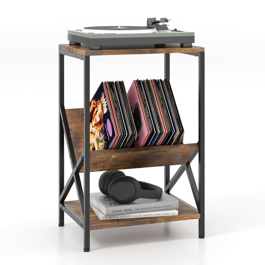 Decorate your living space with our versatile 3-tier record player stand. The beautiful wood grain and black frame bring a touch of texture to different spaces, such as living rooms, bedrooms, or studies. If needed, it can also serve as a sofa side table, a nightstand, or a small bookshelf. Moreover, our record player table also features a top shelf, a V-shaped bookshelf, and a bottom shelf for you to place your record players, CDs, and speakers. Plus, to ensure overall stability and safety, the industrial side table is equipped with a solid X-shaped metal frame and adjustable foot pads.