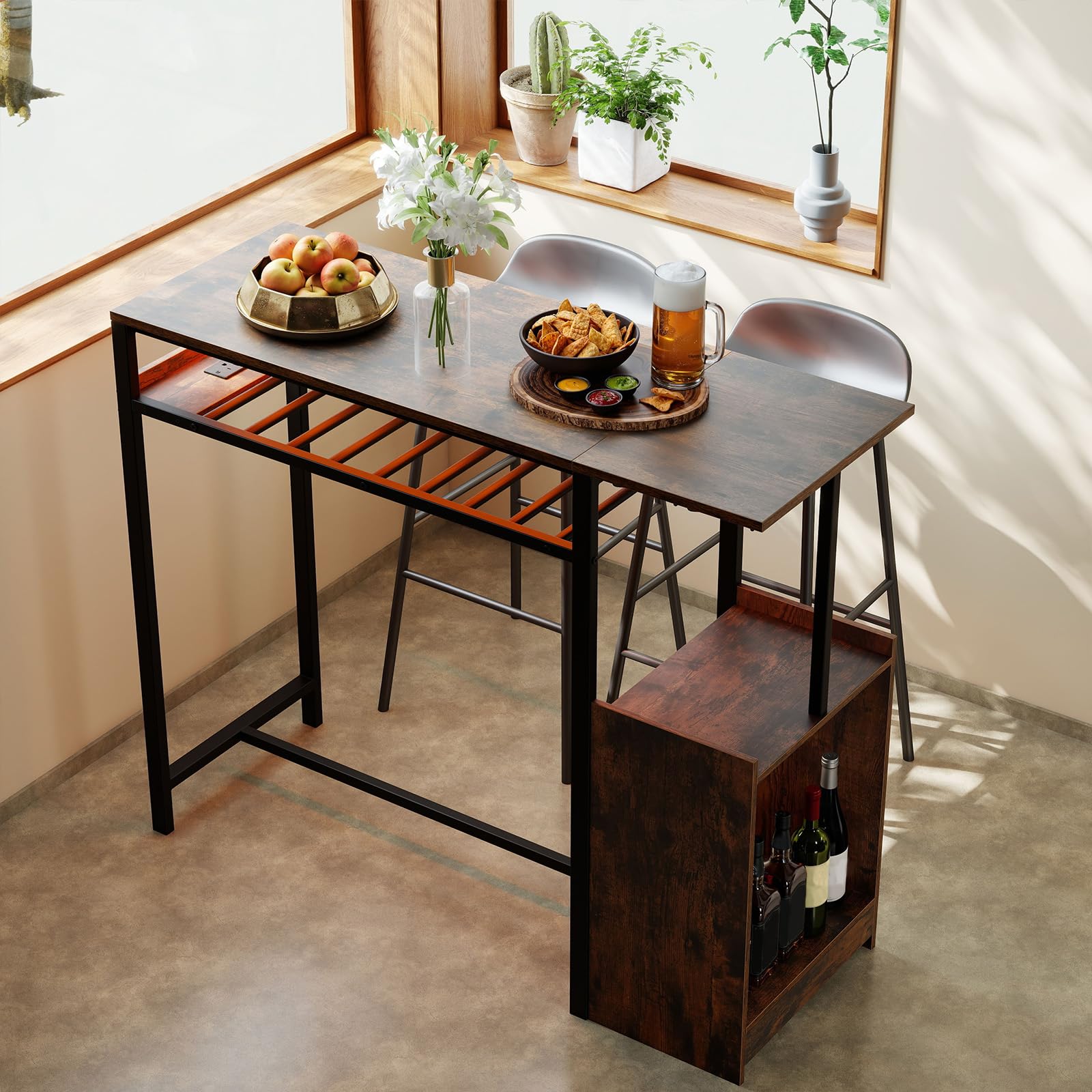 This high top coffee table boasts a spacious industrial-style tabletop with 2 side shelves, offering plenty of room for your wine collection and daily use. With a wine rack that holds up to 8 bottles and two rows of glass racks for 10 glasses, this pub table is designed for both functionality and elegance. Moreover, the built-in power strip includes 2 AC outlets, 1 USB port and 1 Type-C port, allowing you to stay connected effortlessly while enjoying your time. Featuring a LED light system controlled by a remote, this cocktail counter height desk offers 16 colors, 4 modes, adjustable brightness and speed to create the perfect ambiance. The sturdy metal frame provides strong stability and long-lasting reliability, making this counter height table a practical and stylish addition to your kitchen or dining area.