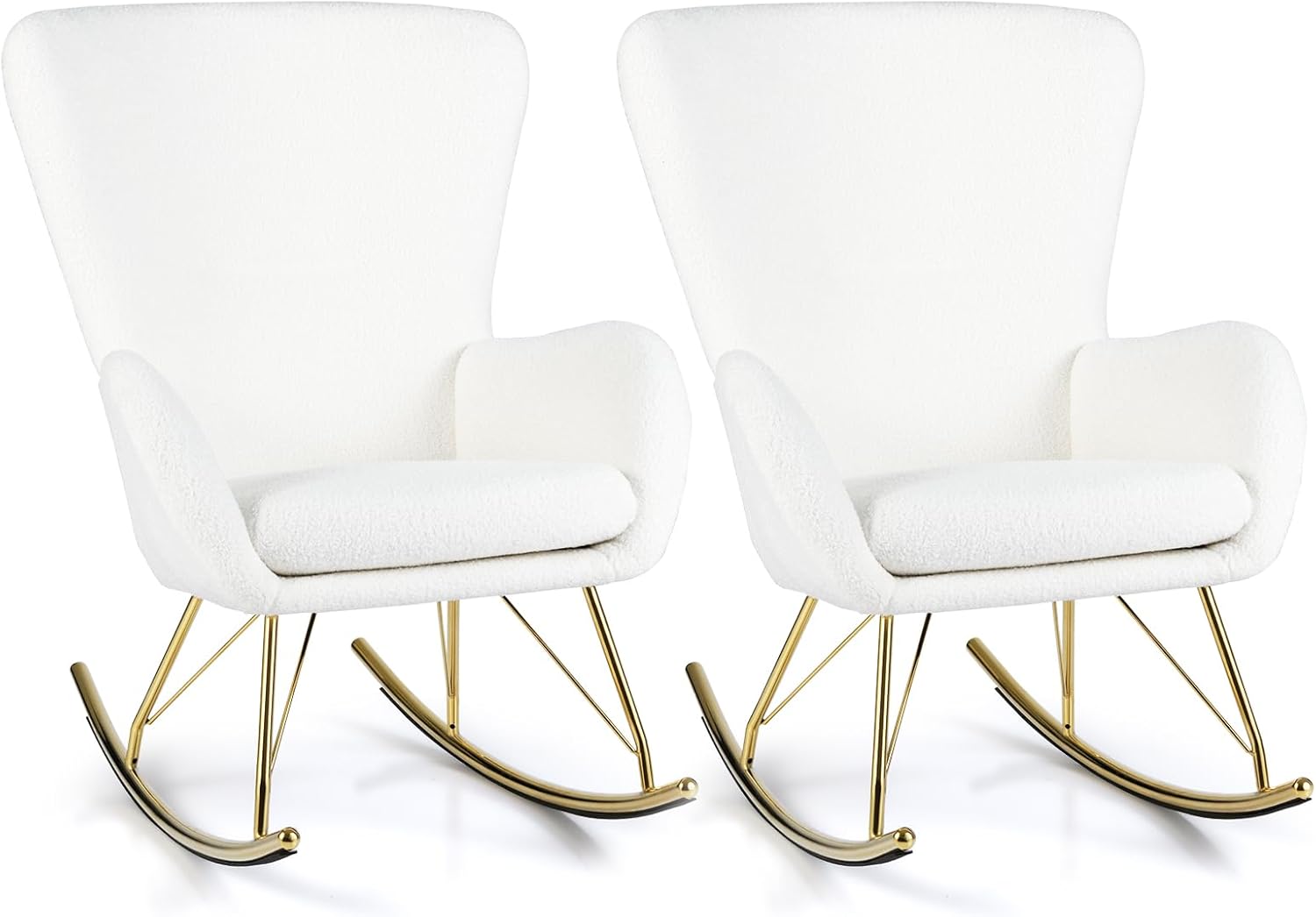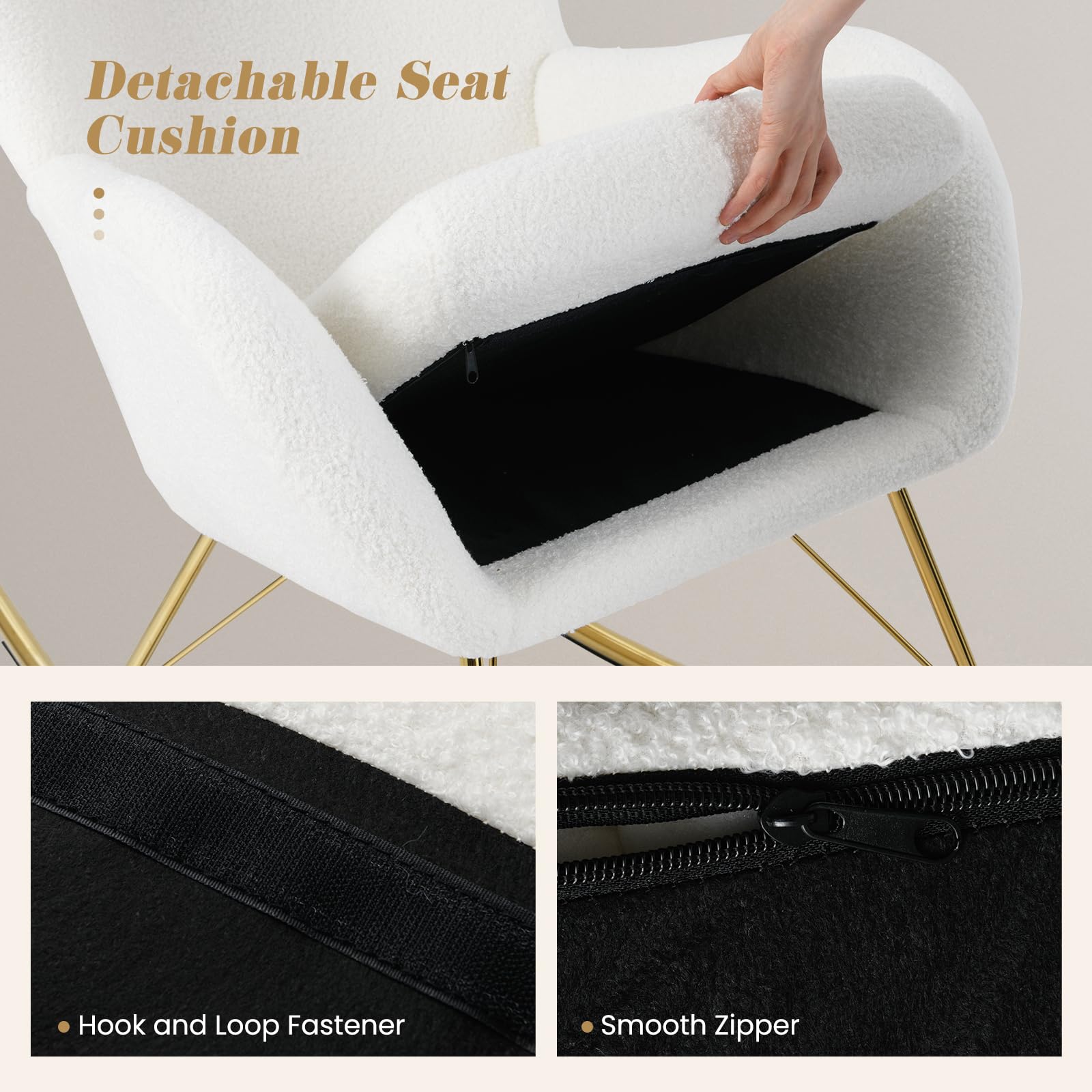 The rocking chair is designed with teddy fleece upholstery and sponge filling to make you feel comfortable. With curved electroplated metal legs and felt foot pads, the accent rocking chair rocks back and forth. Furthermore, the high backrest, thick seat cushion, and curved armrests ensure ergonomic comfort. If needed, you can easily remove the seat cushion. The solid metal frame allows for great strength and stability. The chair is a wonderful addition to living rooms, bedrooms, offices, and more.