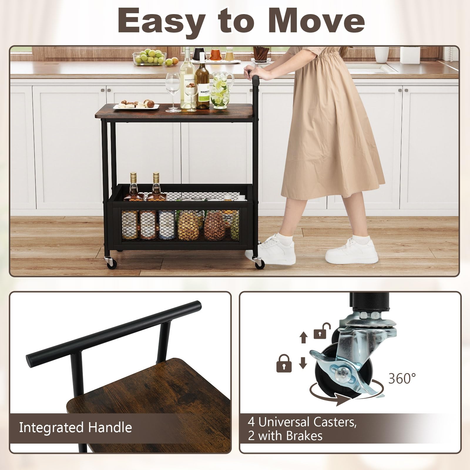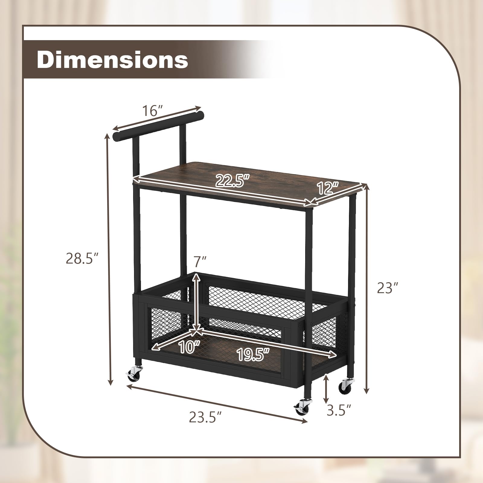Transform your space with this chic and sturdy rolling end table. Boasting dual-tier storage for your daily essentials, snacks, and more, you’ll love the easy access while relaxing. Built tough, this versatile cart handles up to 90 lbs with a rugged frame and stylish, easy-to-clean surface. Glide from room to room on 4 universal casters, 2 with brakes, from kitchen to couch, staying safe with smart locks and ergonomic touches. Plus, the trendy industrial look with rustic shelves and matte-black steel fits beautifully anywhere, as a stylish bedside companion or a handy snack hub! Own the blend of durability, style, and smooth mobility--revamp your space with functional flair!