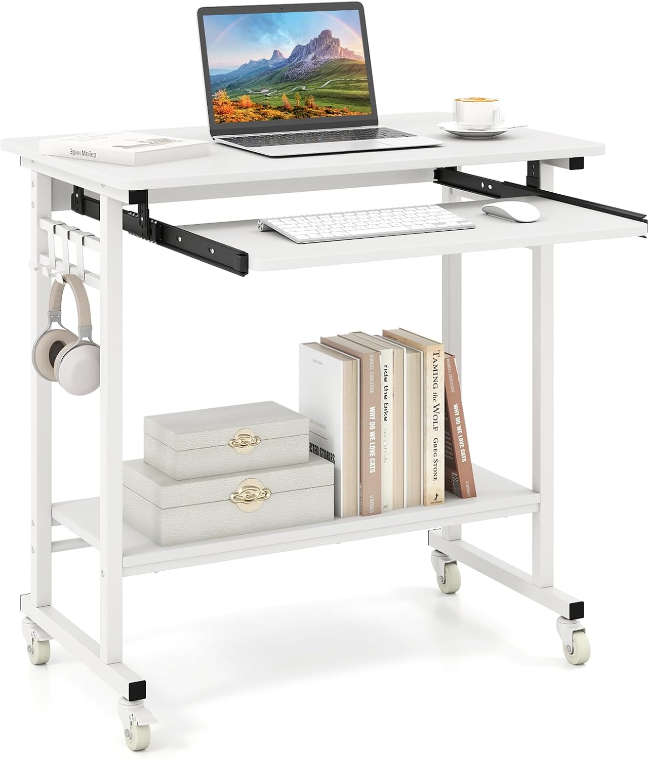 Introducing the ultimate companion of productivity - the rolling computer desk! Get ready for the efficient workflow, as the home office desk offers roomy workspace from a wide desktop & a keyboard tray. But that’s not all! It also has an open shelf & 3 hanging hooks for added storage. With lockable universal wheels, the computer cart for small space can accompany you wherever inspiration strikes in the house. Its metal frame boasts perfect welding & offers a large desktop load capacity of 160 lbs, which ensures high strength & durability. Embark on a transformative journey of productivity today!