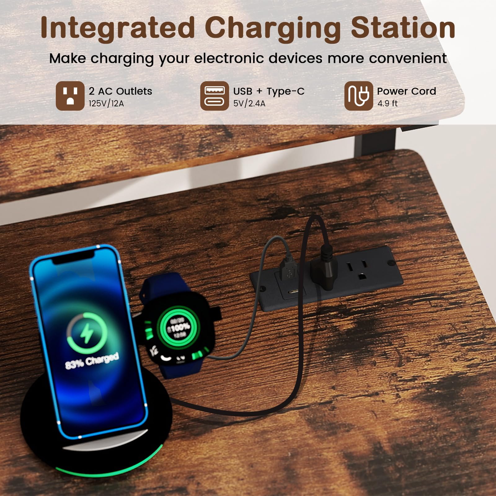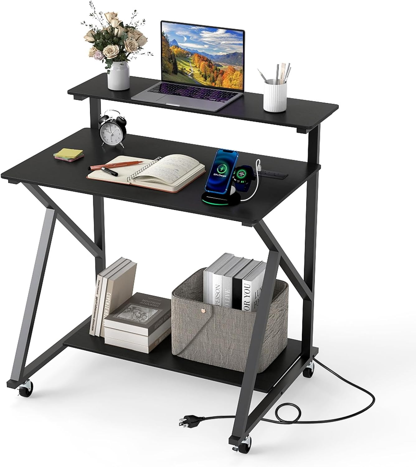 This versatile rolling home office desk combines robust construction with thoughtful design, featuring reinforced cross tubes and bottom support crossbars for lasting stability and an easy-to-clean surface. Plus, the ergonomic monitor stand on the study table elevates your screen to reduce neck and eye strain, enhancing comfort during long study or work sessions. The ergonomic elevation provides a more comfortable viewing angle compared to standard desk heights. Equipped with 4 quiet and 360° rotating wheels, 2 lockable for secure positioning, this computer desk offers seamless mobility between rooms. Meanwhile, the desk also boasts a spacious tabletop and a practical bottom shelf for organized storage of books and supplies. Most importantly, an integrated charging station with 2 AC outlets plus USB and Type-C ports transforms this compact study desk into a convenient power hub, keeping your devices charged and ready for devices. More well-made details are waiting for your exploration.