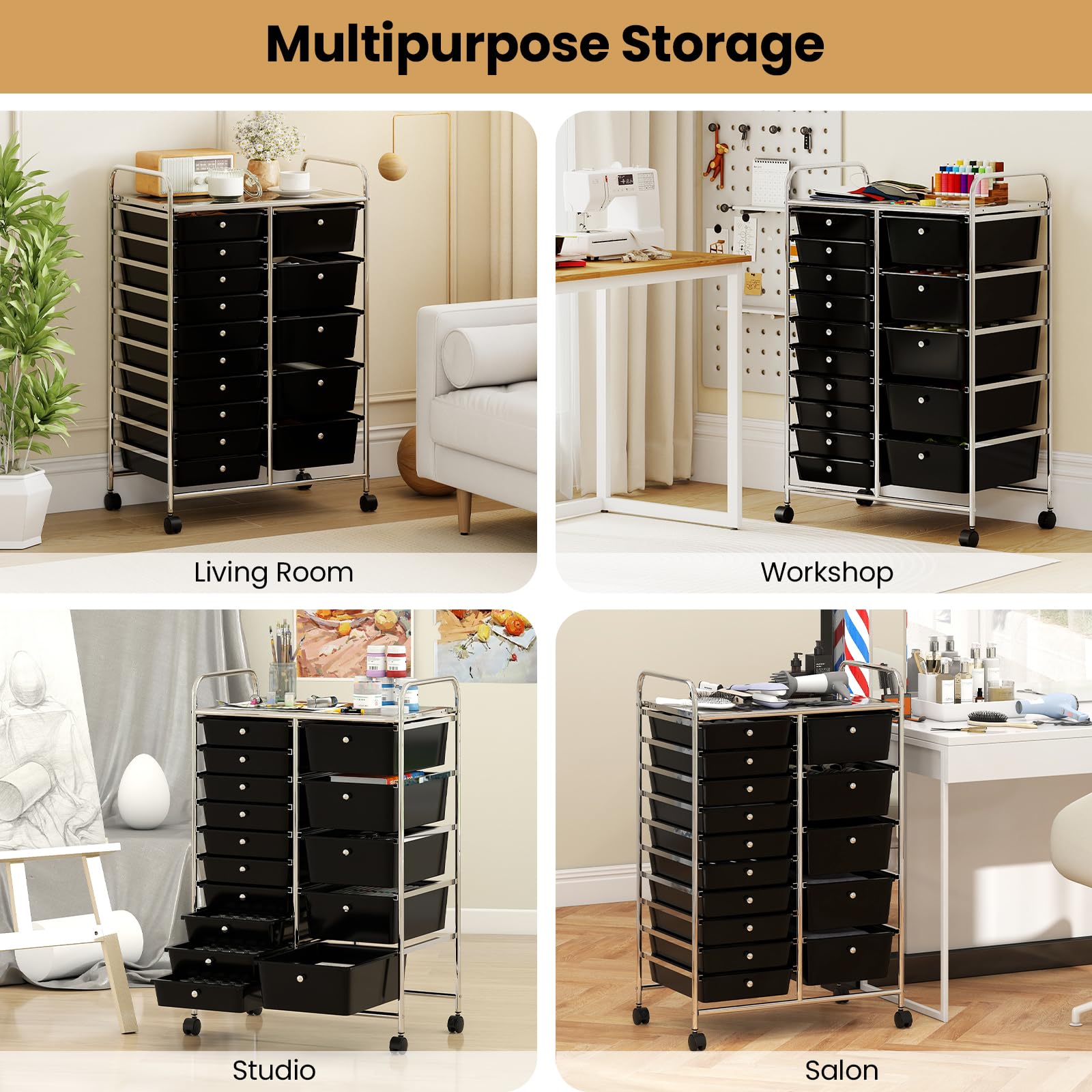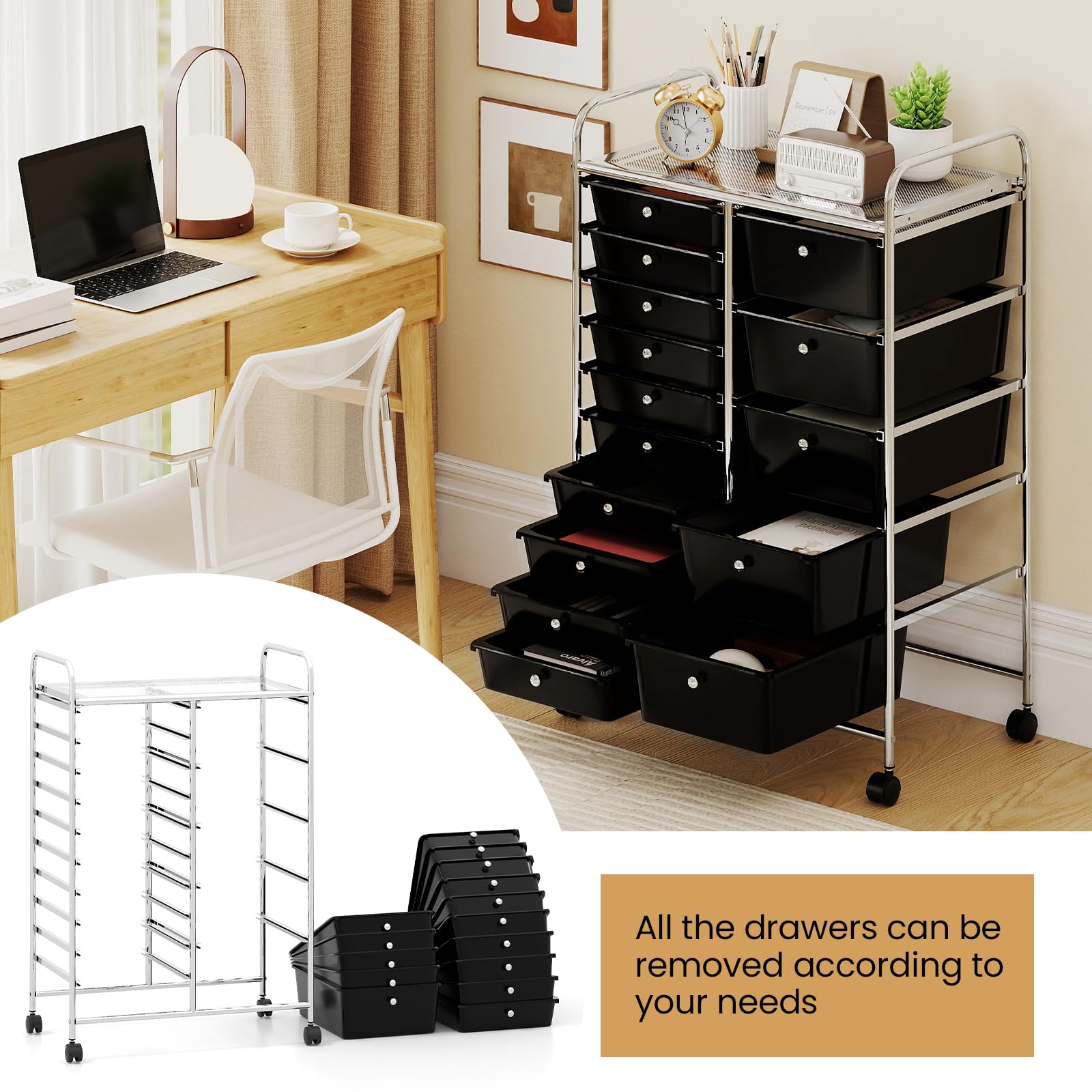 Supported by a chrome-plated metal frame, this mobile craft organizer is built for everyday use with its sturdy construction. The top shelf and smooth-gliding drawers provide easy access and flexible storage options. Equipped with 360° swivel wheels, including 2 locking casters to keep it secure when needed, the rolling utility cart organizer effortlessly moves between rooms. Whether you are organizing craft materials, office essentials, cosmetics, or tools, this plastic organizer trolley adapts to your requirements, making it ideal for craft rooms, studios, classrooms, etc.