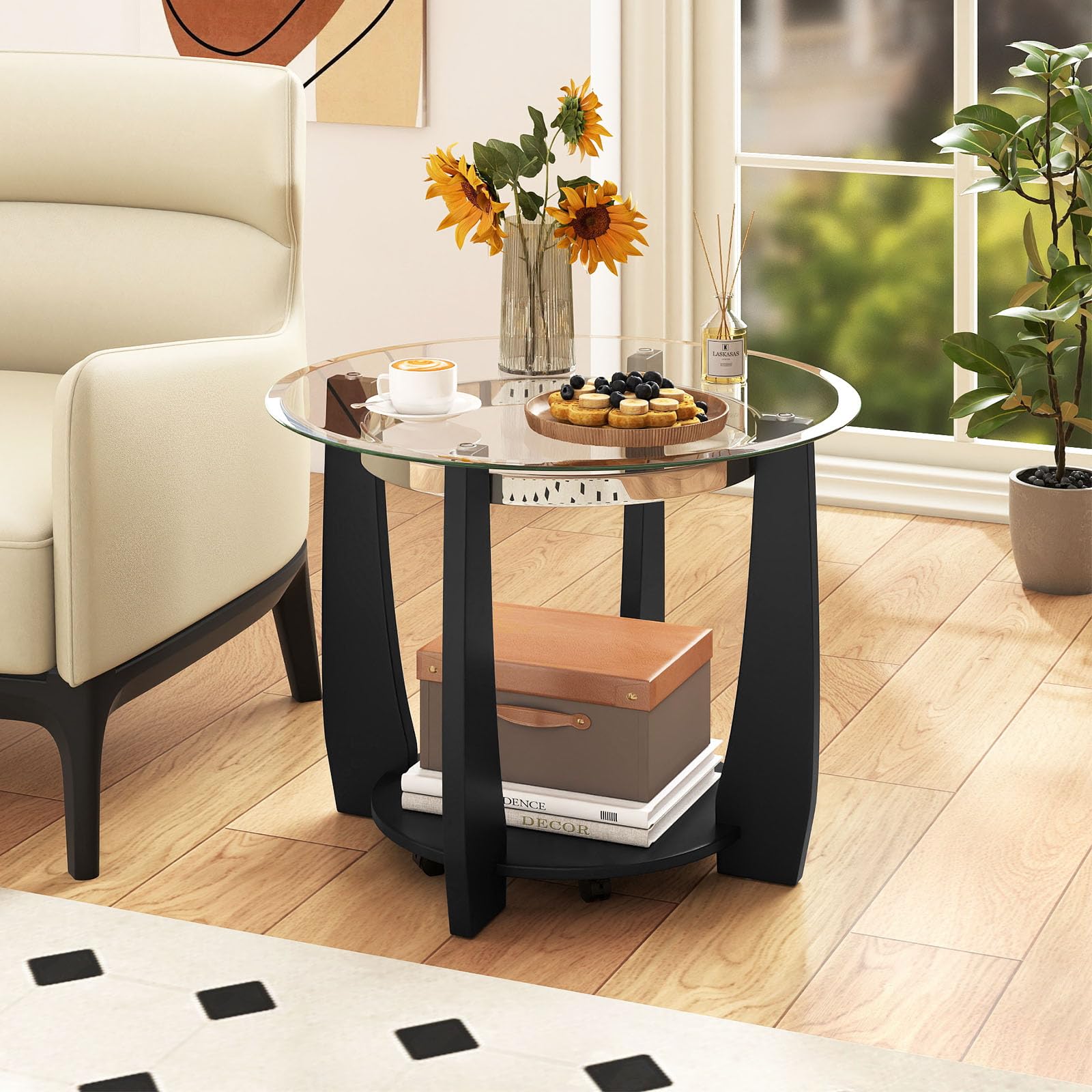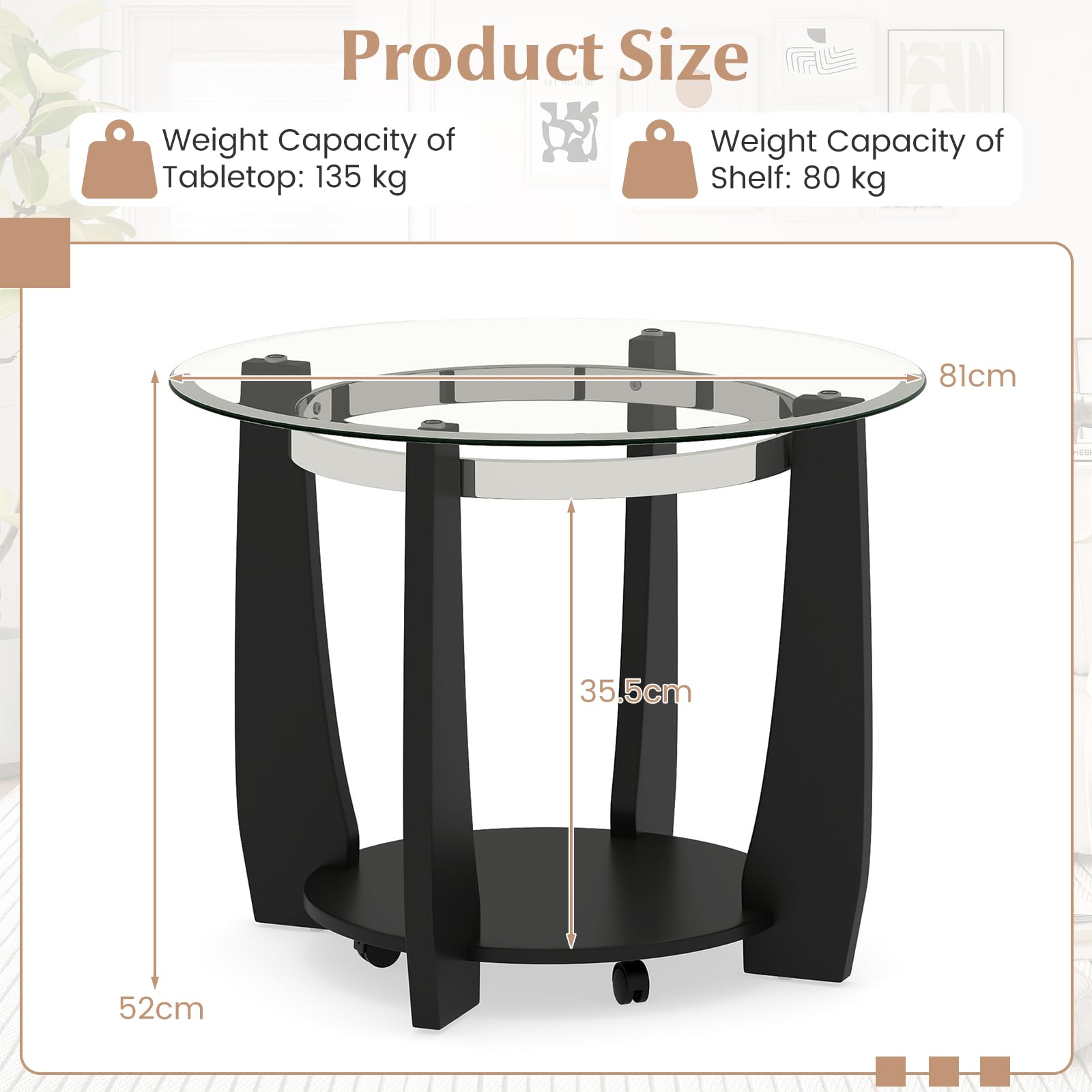 The center table features a thick tempered glass tabletop that combines high strength with long lifespan. For storage convenience, the top surface and storage shelf provide ample storage space to keep essentials organized. Supported by solid rubber wood legs, the round tea table balances sturdiness with reliability. Equipped with 4 universal wheels (2 with brakes), the glass coffee table offers effortless mobility and secure placement. This rolling cocktail table combines convenience with contemporary design, serving as a functional accent piece that adapts to various room layouts.