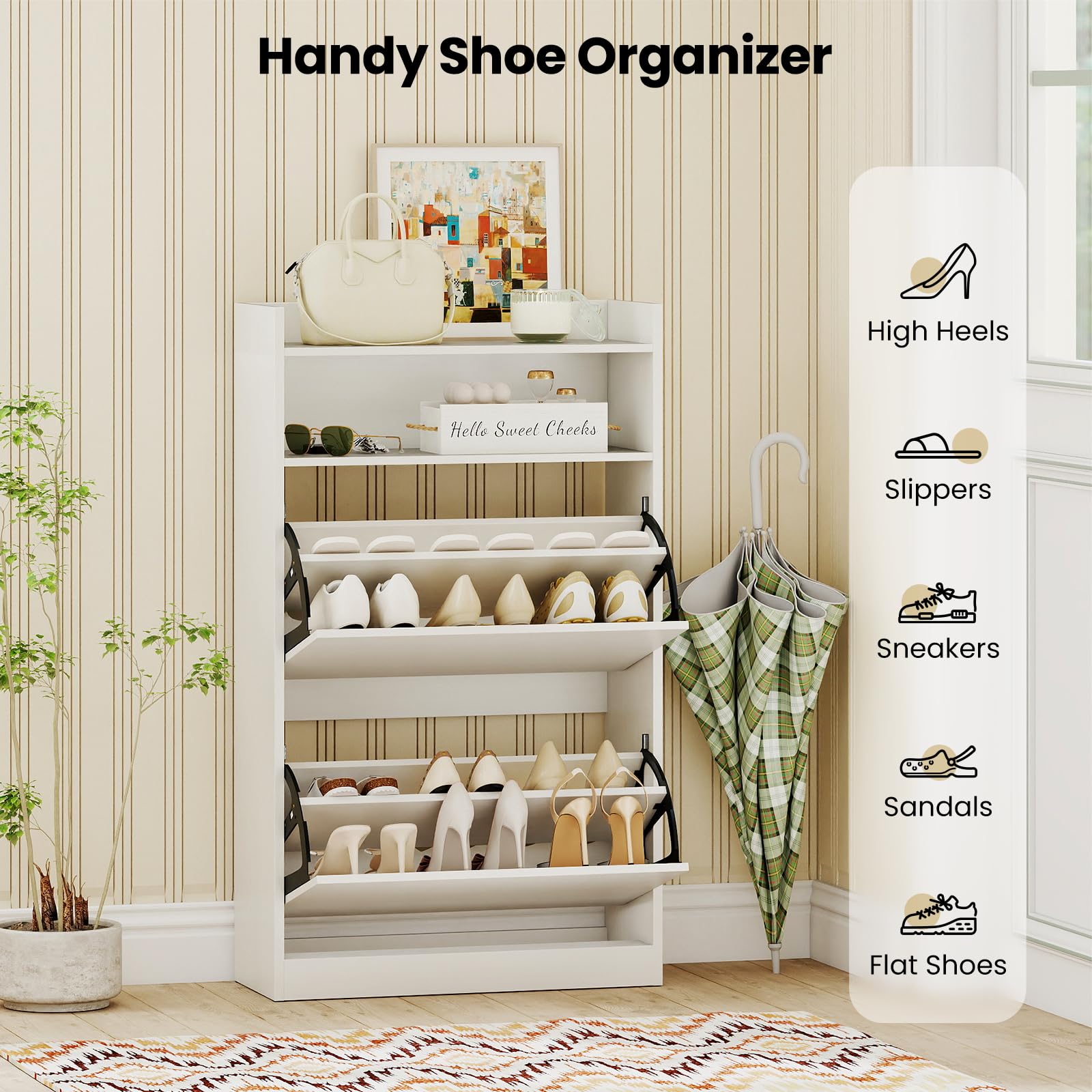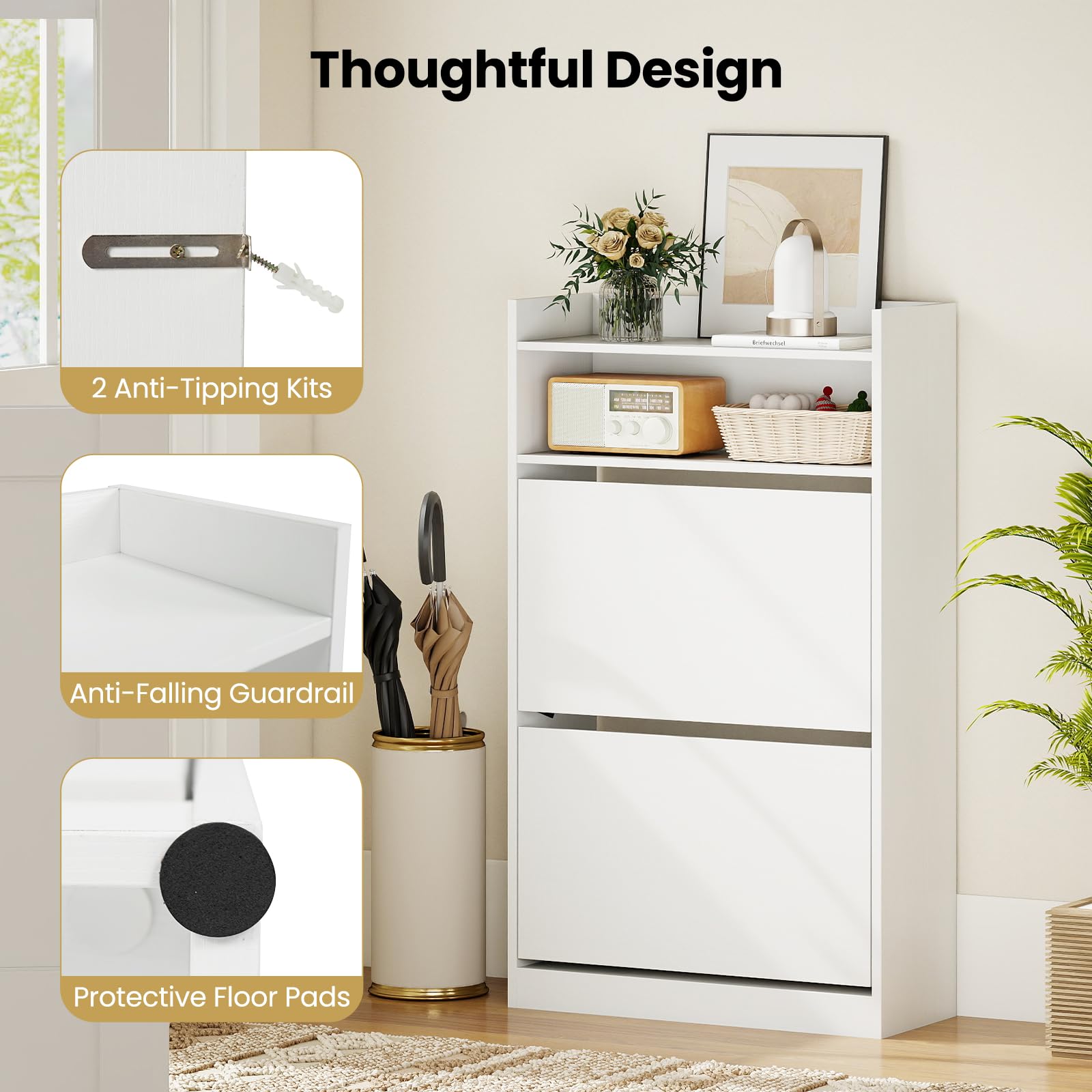 Discover a space-saver that keeps your shoes pristine and your essentials within reach! Our chic shoe storage cabinet features adjustable dividers in 2 flip drawers, perfect for various shoe types. Say goodbye to clutter with 2 open shelves with a secure top baffle that prevents items from sliding off. Experience the sturdy elegance with scratch-resistant materials, supporting your shoes without faltering. Peace of mind? With the thoughtful design of anti-tip kits and non-slip features, the freestanding cabinet stays put. All this in a sleek, space-efficient design that slips effortlessly into tight spots, enhancing any entrance or hallway!