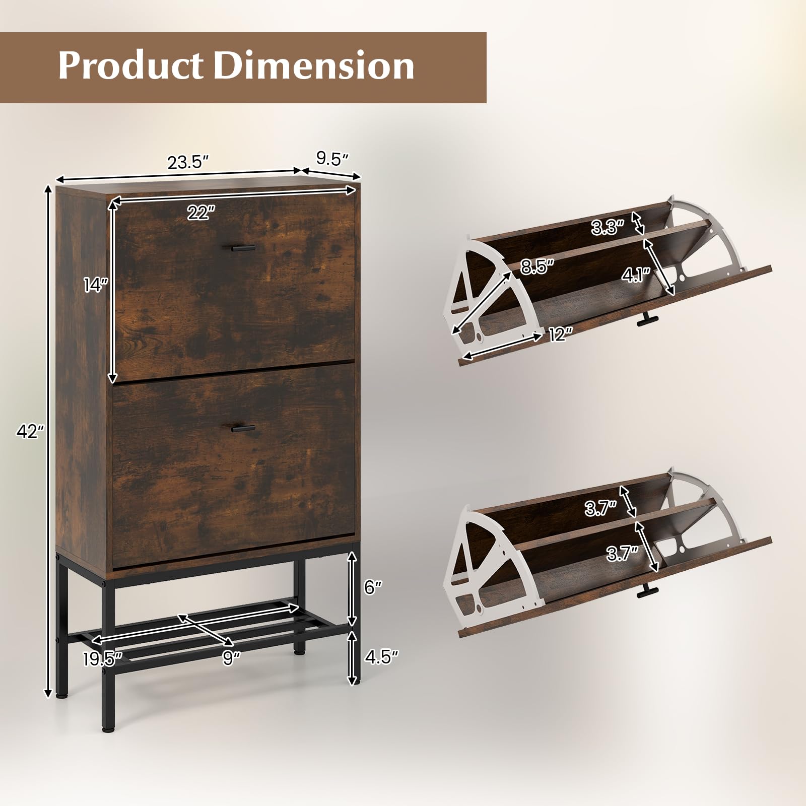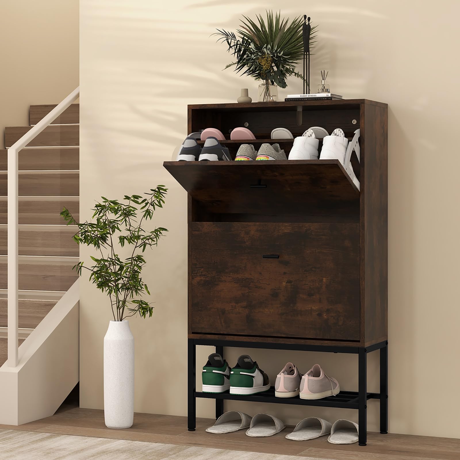 - 【Flexible Shoe Storage】: This shoe storage cabinet is designed with 2 flip drawers that are easy to pull out and put back. With adjustable and removable shelves, the drawers will fit accommodate various types of footwear, from flat sandals to high heels.