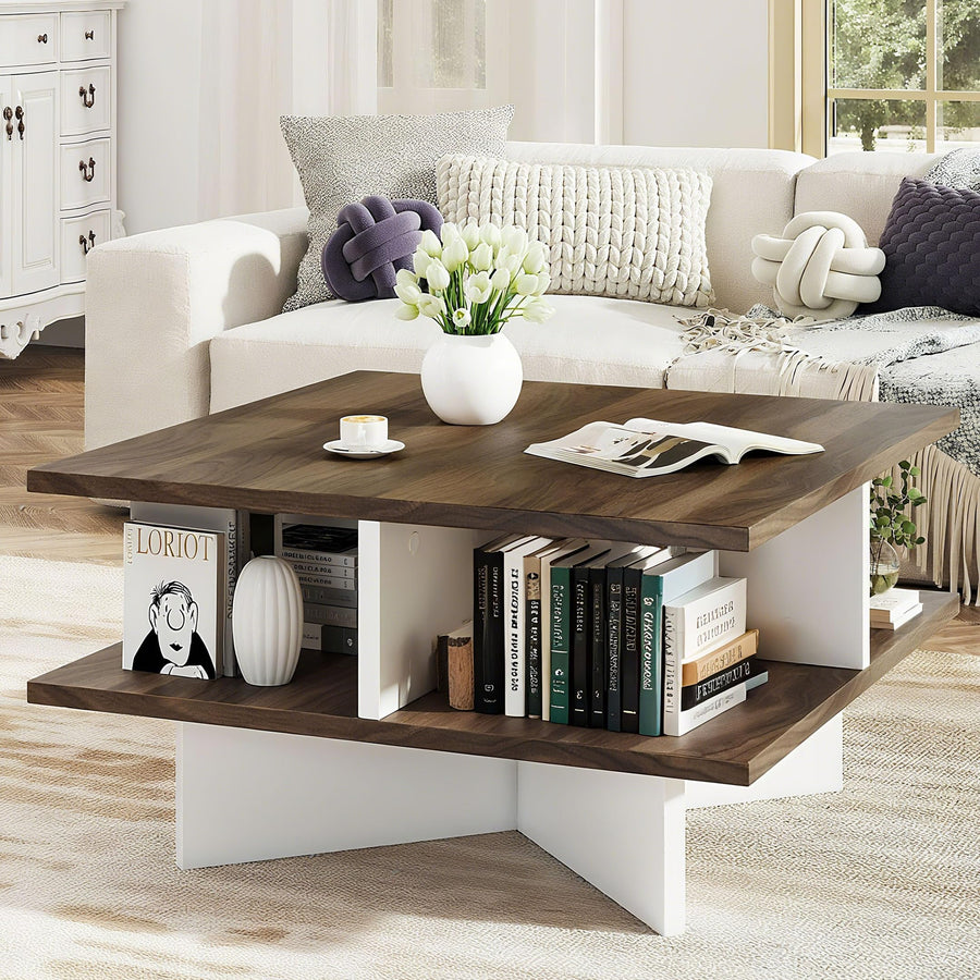 Maximize your space with style with our 2-tier coffee table! Featuring a spacious 24" x 24" tabletop and 4 open storage compartments, this practical square table is perfect for organizing books, snacks, decorations and more. The cross-shaped base ensures superior stability, while the wood grain finish adds a touch of farmhouse elegance. Versatile and functional, this unique geometric coffee table adds an artistic flair and a modern touch to your space. Experience endless possibilities with this statement piece in your living space!