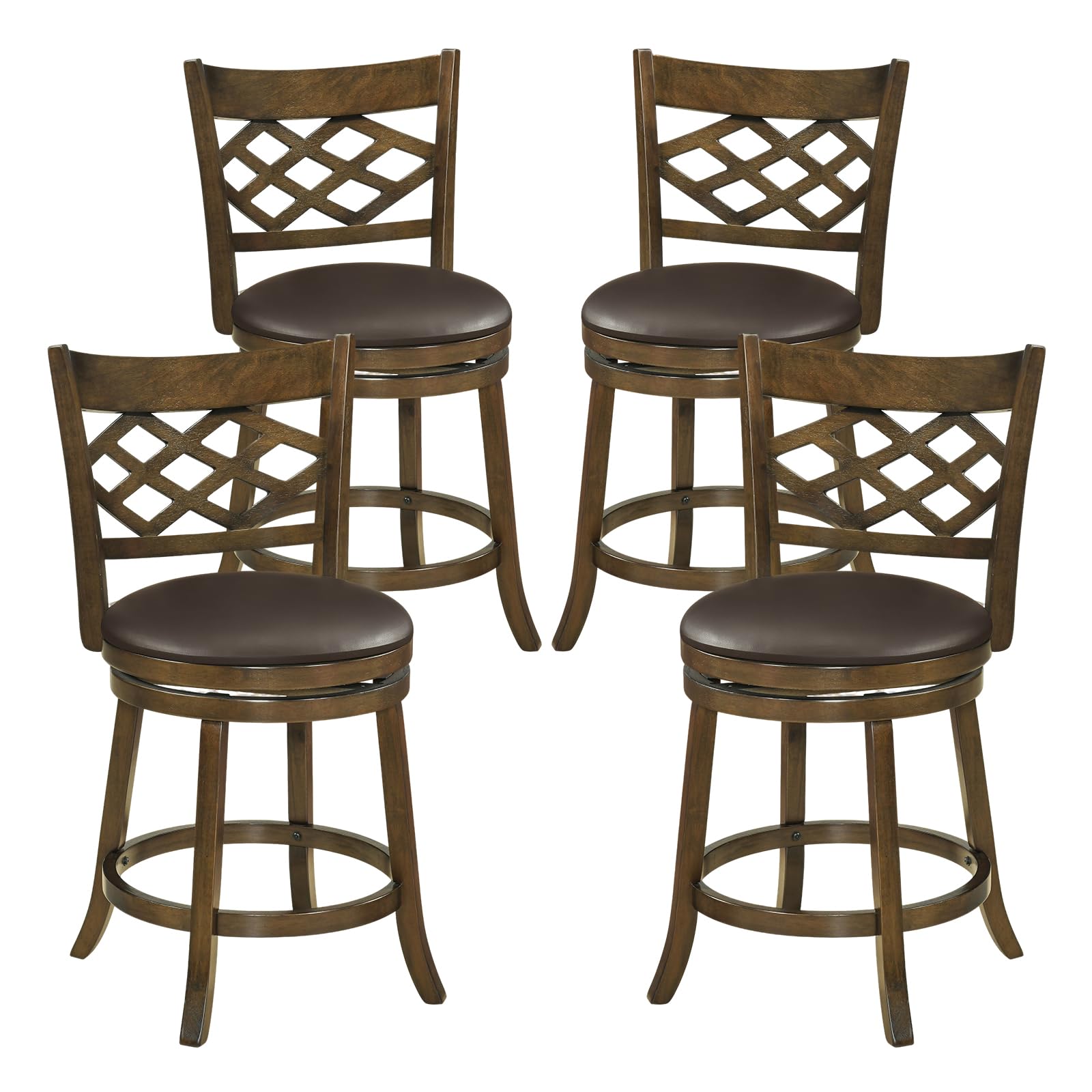 These barstools are expertly crafted with solid rubber wood frames known for their strength and resistance to cracking. Each stool features a soft upholstered seat padded with high-density sponge for lasting comfort, along with a built-in footrest to support and relax your legs. The 360° swivel function allows effortless movement and easy interaction without needing to stand. Designed with stability in mind, these stools have reinforced crossbars and outward-angled legs, complemented by anti-slip foot pads that keep them steady on your surface. Showcasing a classic mid-century design, the stools highlight elegant wood grain and intricately designed backrests, making them suitable for kitchen islands, cafes or pubs.